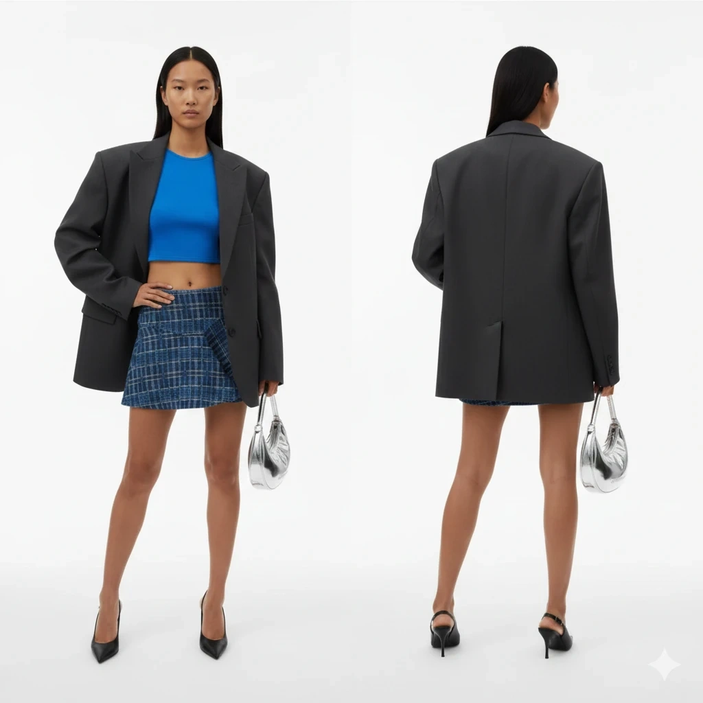 Pleated and ruffle accents at the front.