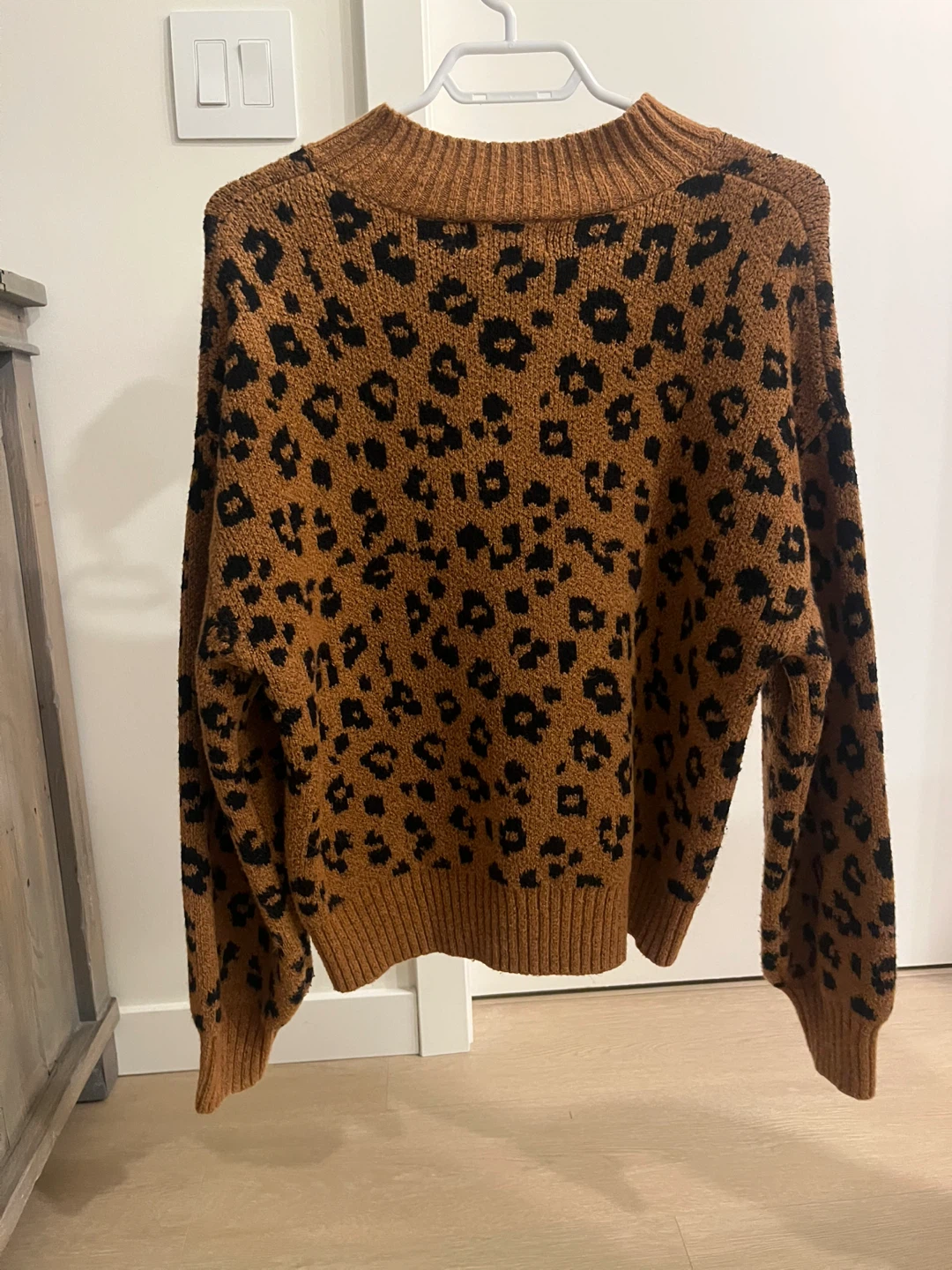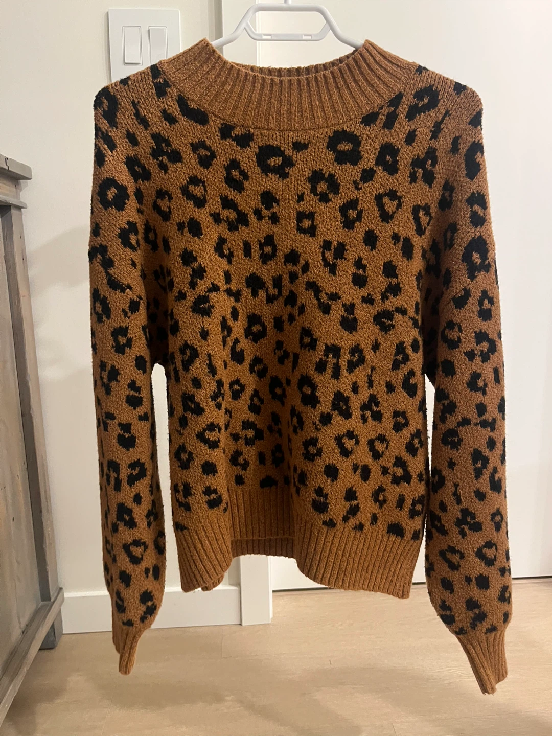 Cozy knit sweater with a classic leopard print design. Ribbed collar, cuffs, and hem. It's a stylish addition for cooler weather!