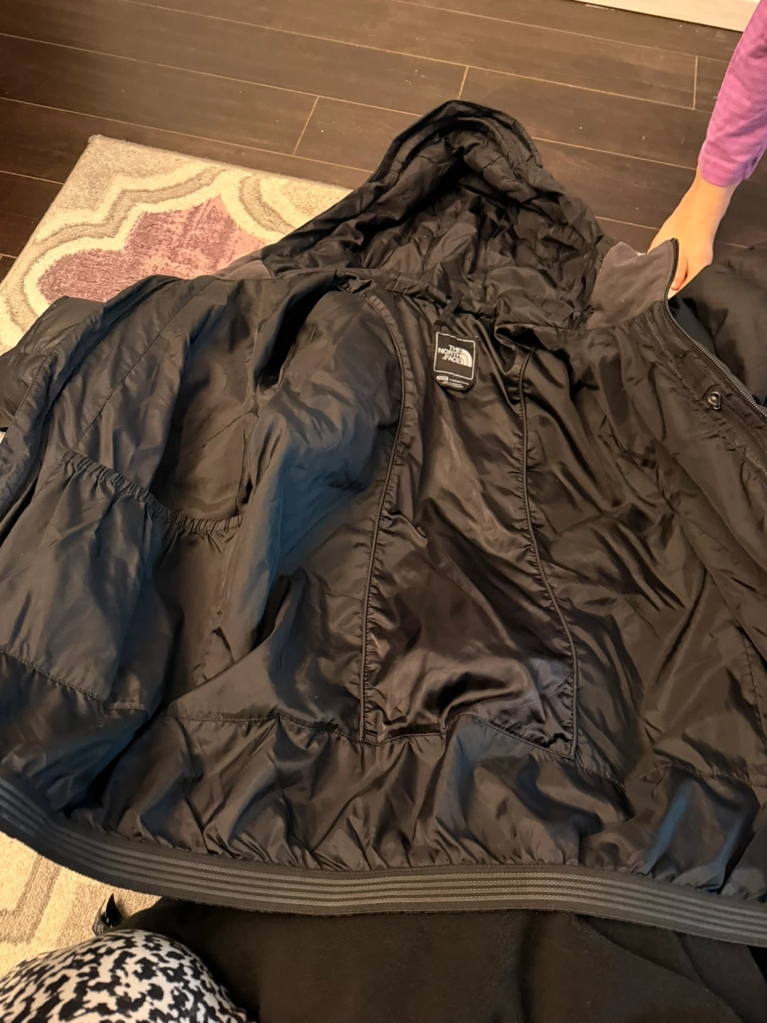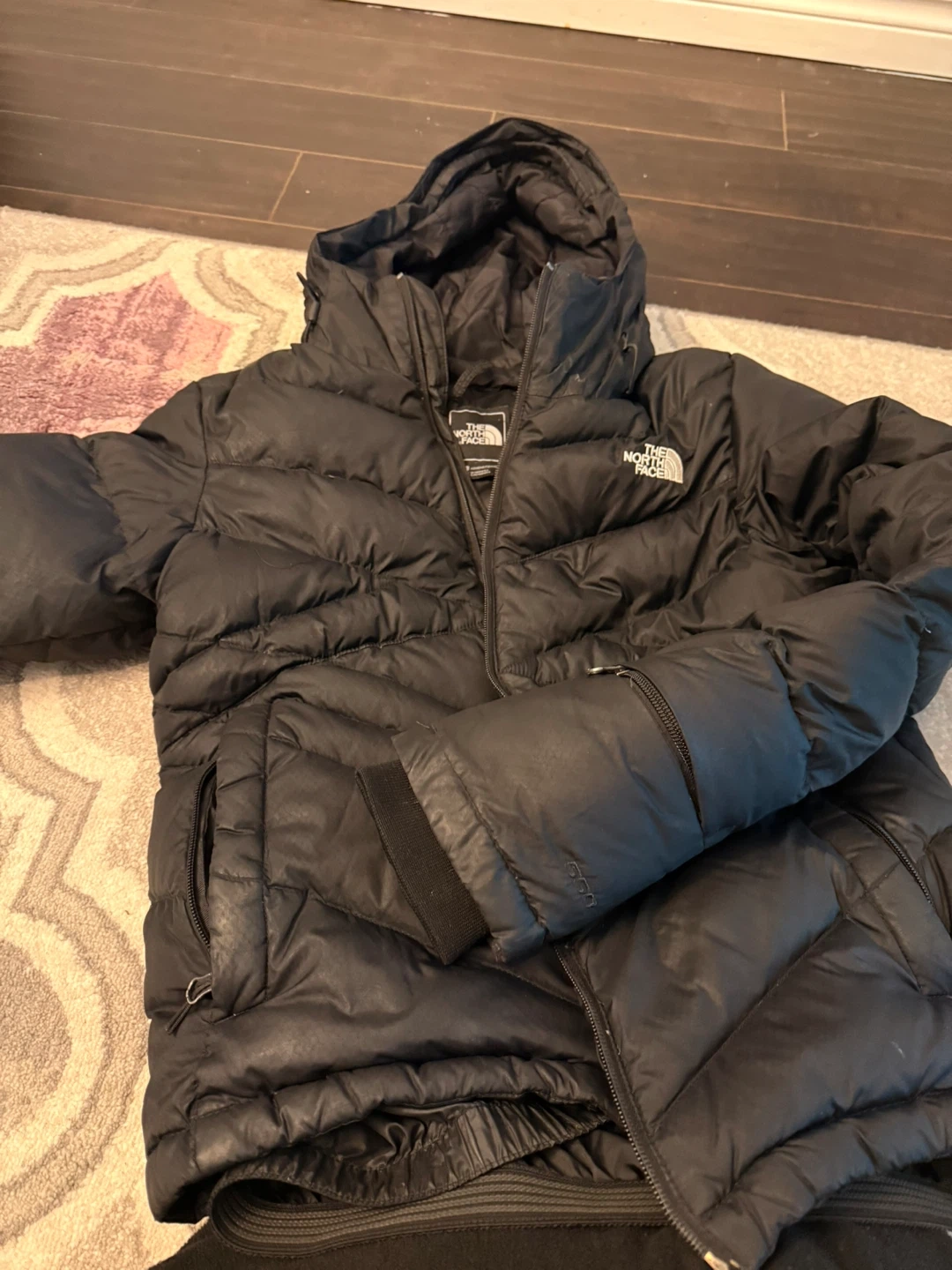 A black puffer jacket from The North Face. It's a warm and stylish winter coat. Features a hood and zippered pockets.