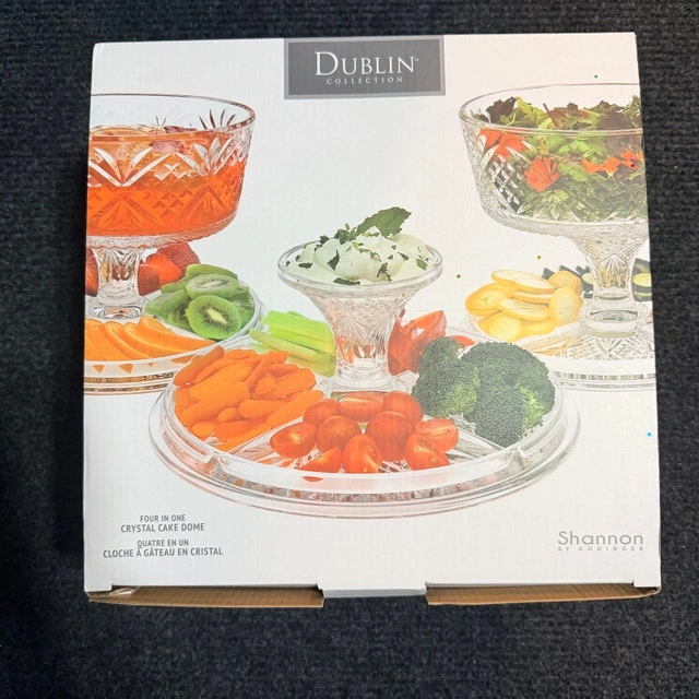 Enhance your table setting with this elegant Dublin Collection Four-in-One Crystal Cake Dome by Shannon. This beautiful piece is new, still sealed in its original packaging, ensuring pristine condition. Perfect for displaying cakes, pastries, or appetizers, it adds a touch of sophistication to any occasion. If the ad is up, it's available!