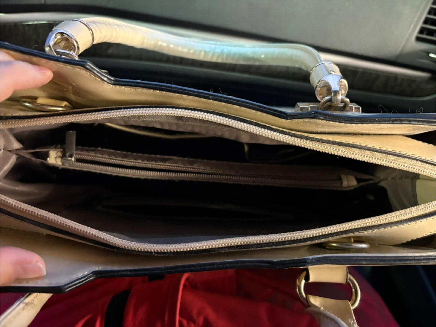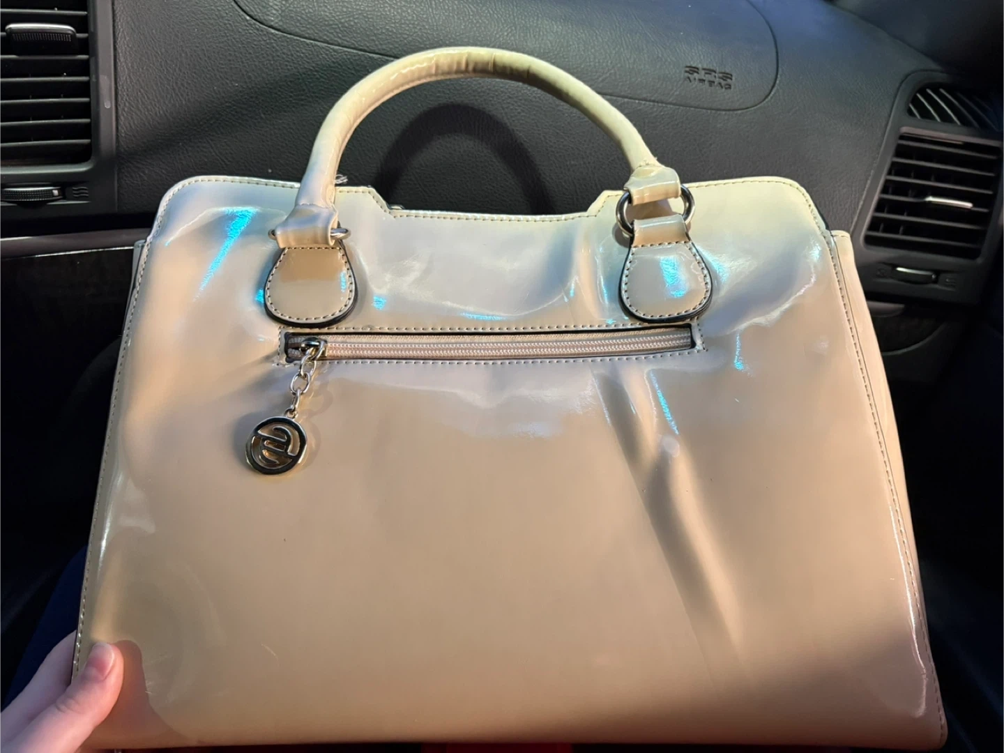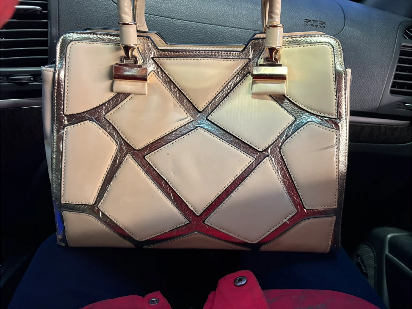 Stylish satchel handbag with a unique geometric design. It features a zip-top closure and interior pockets for organization. The smooth finish and gold-tone hardware add a touch of elegance. This bag is perfect for everyday use or a night out!