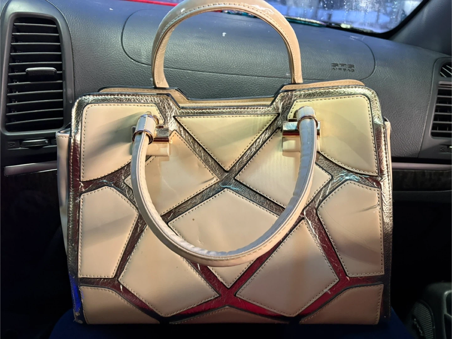 Stylish satchel handbag with a unique geometric design. It features a zip-top closure and interior pockets for organization. The smooth finish and gold-tone hardware add a touch of elegance. This bag is perfect for everyday use or a night out!