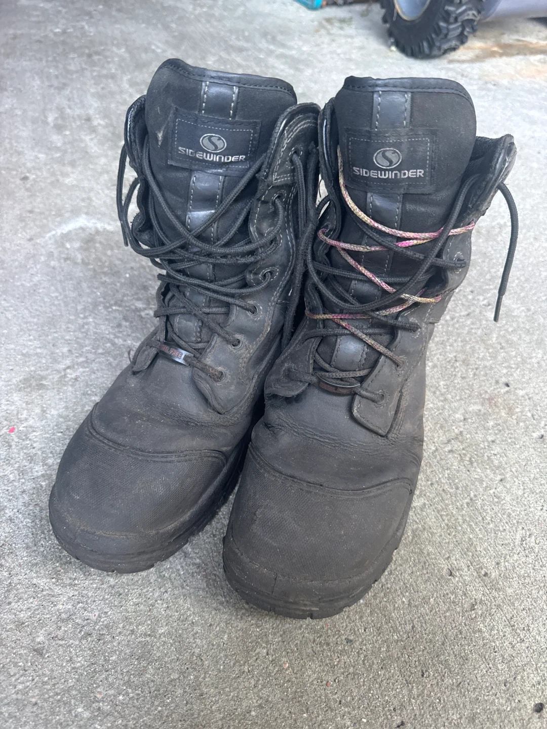 Selling a pair of Sidewinder work boots in size 10. They are black and waterproof, perfect for tough jobs. Needs replacement of the lace.