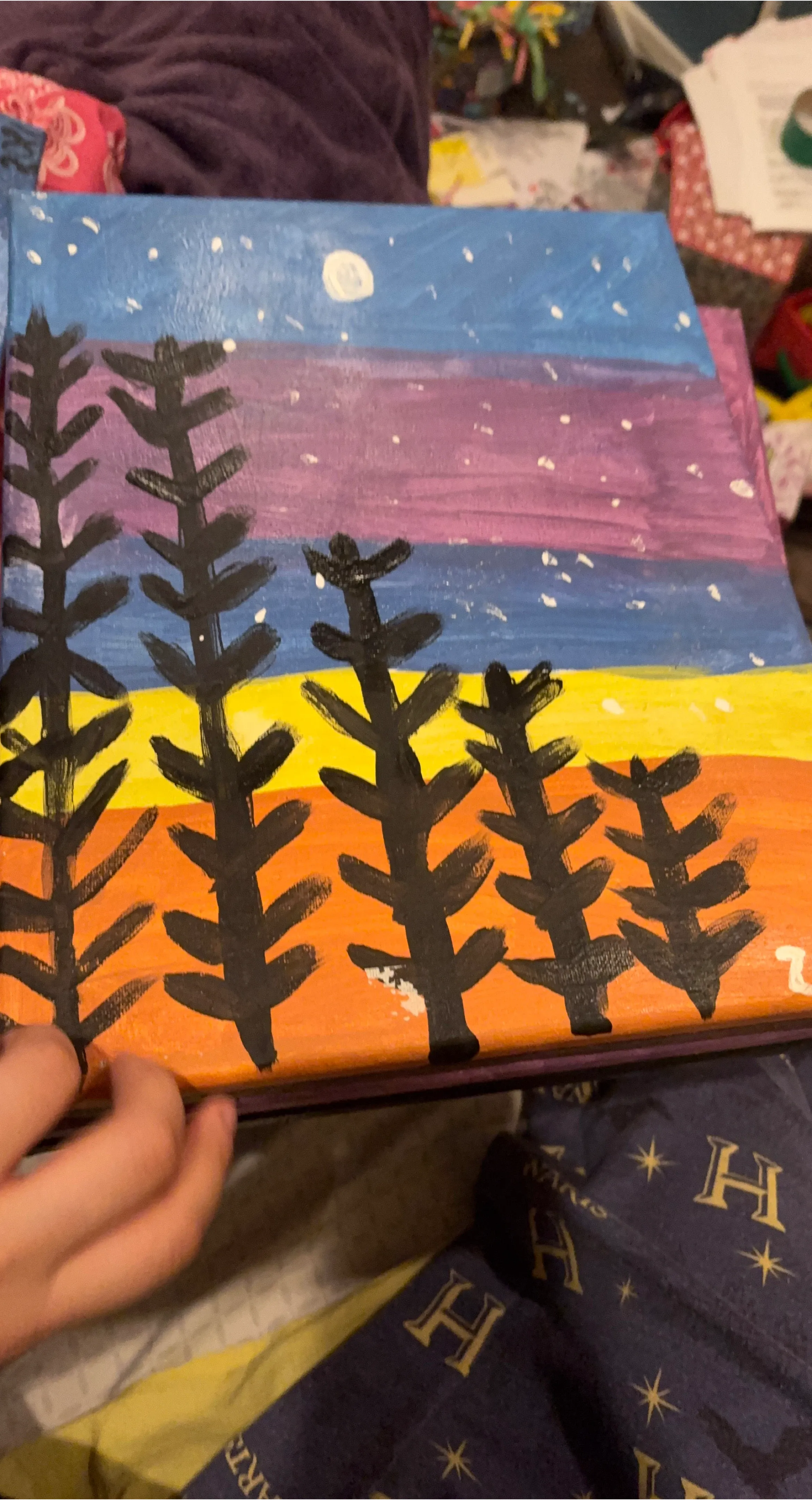 This is a unique, hand-painted canvas art piece featuring a colourful landscape with trees under a starry sky. It's a great way to add a personal touch to your space
