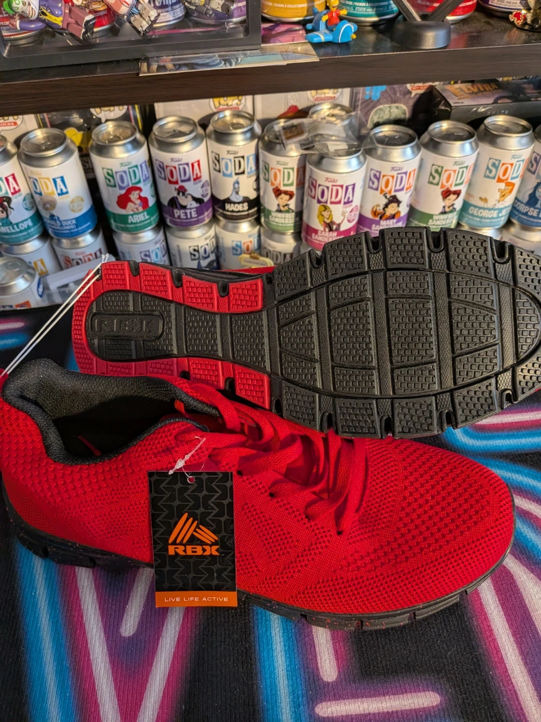 RBX athletic shoes in red. Upper and lining are textile, outsole is man-made. Size US 12