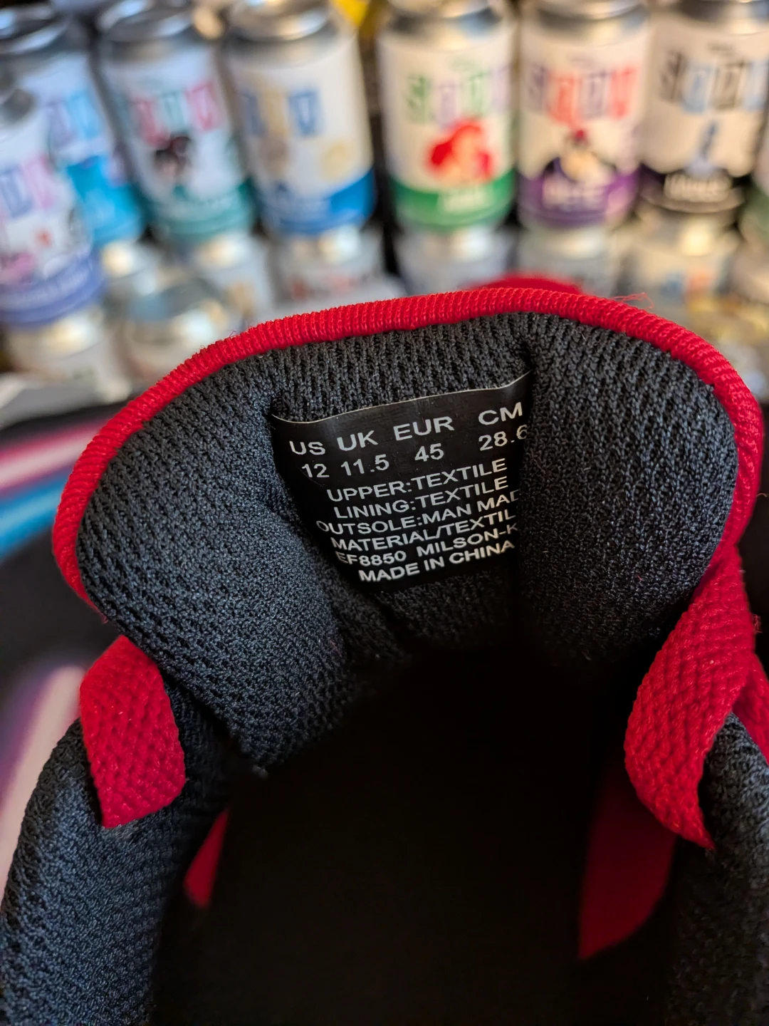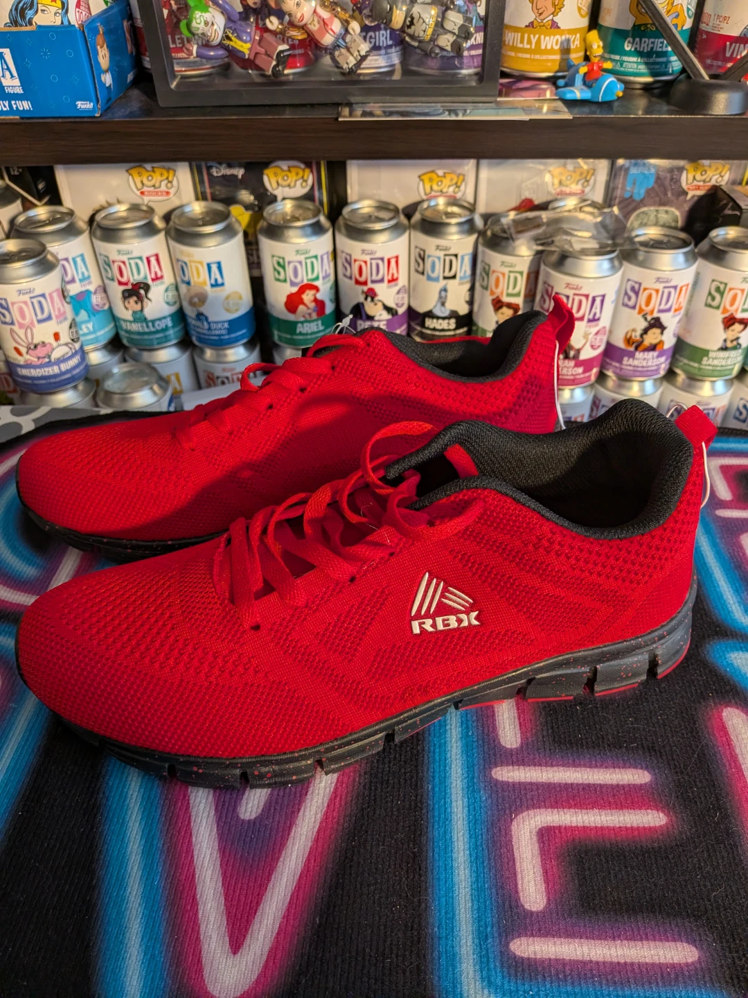 RBX athletic shoes in red. Upper and lining are textile, outsole is man-made. Size US 12