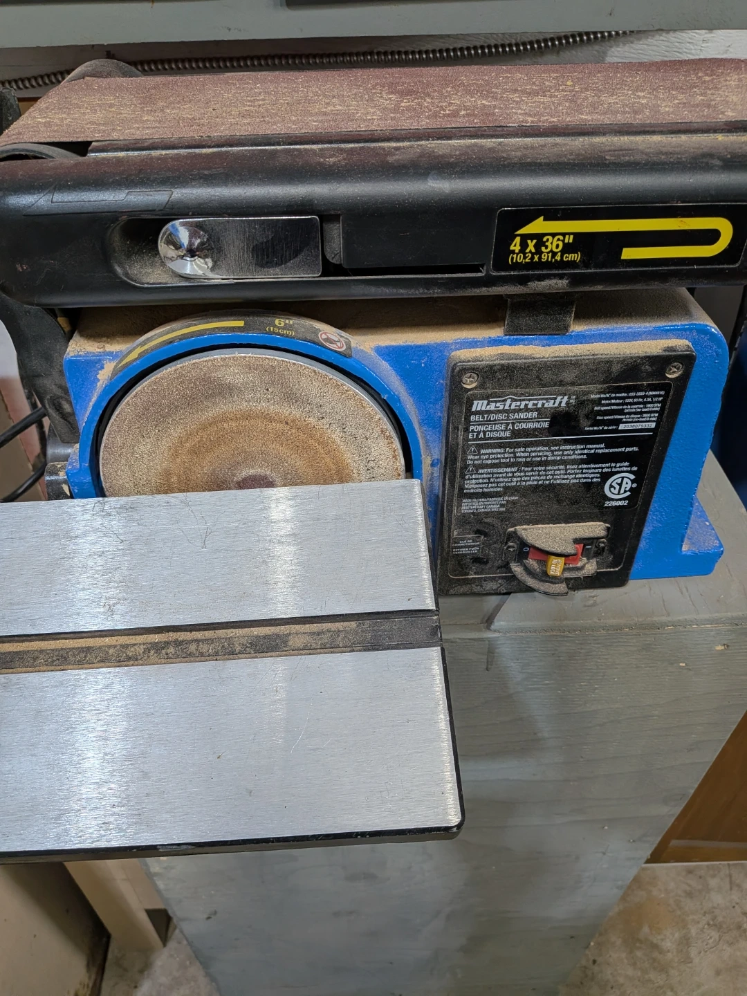 This Mastercraft belt and disc sander is model 055-3559-4. It's designed for sanding operations. The belt size is 4 x 36 inches (10.2 x 91.4 cm). This tool is great for woodworking projects and shaping materials.