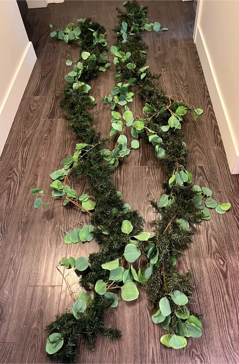Selling two beautiful garlands, each approximately 9 feet long. They feature a mix of eucalyptus and pine, perfect for adding a touch of greenery to your home decor. Great for mantles, tablescapes, or any space needing a natural accent. Remove the eucalyptus and use any time of year!