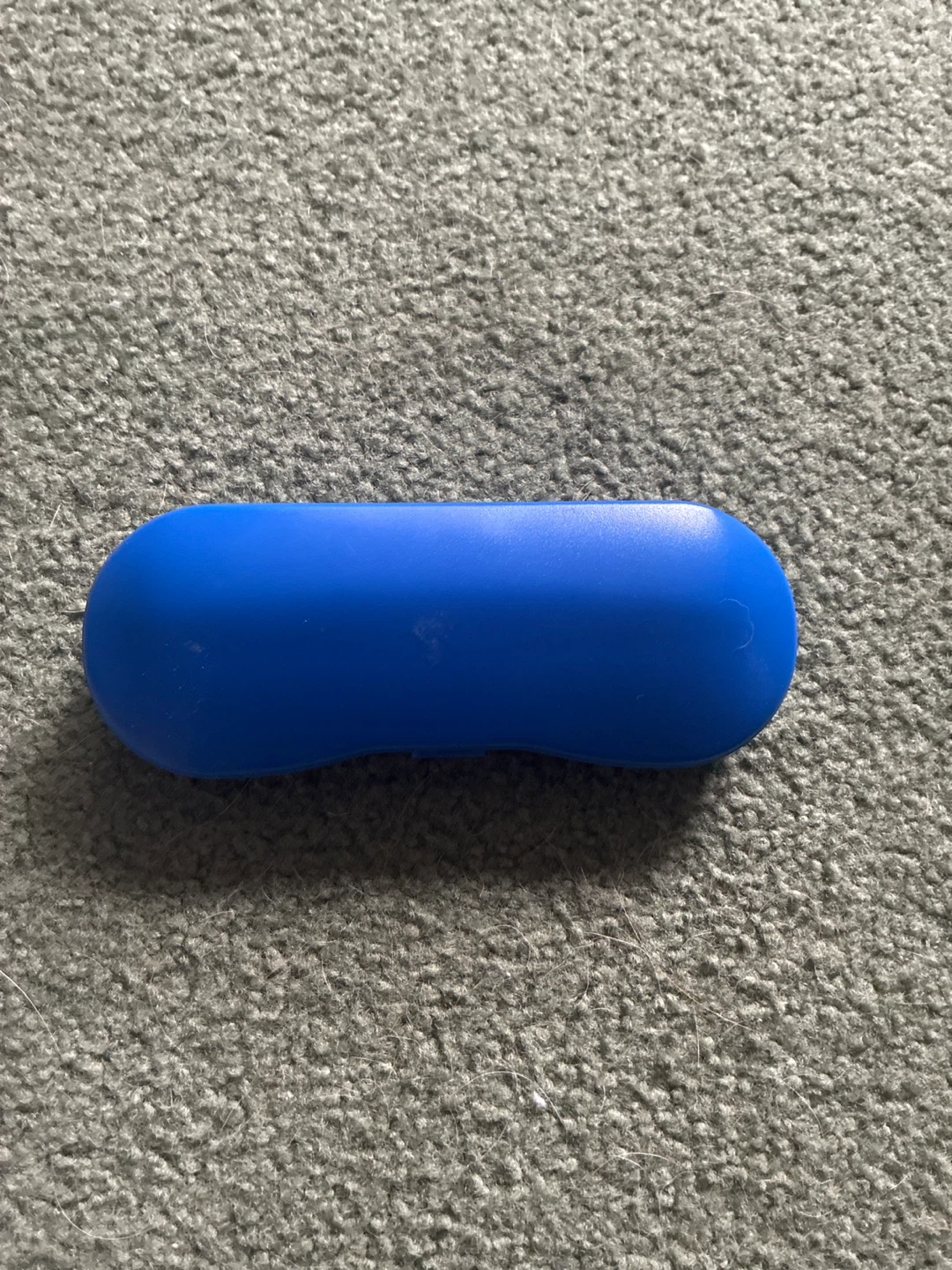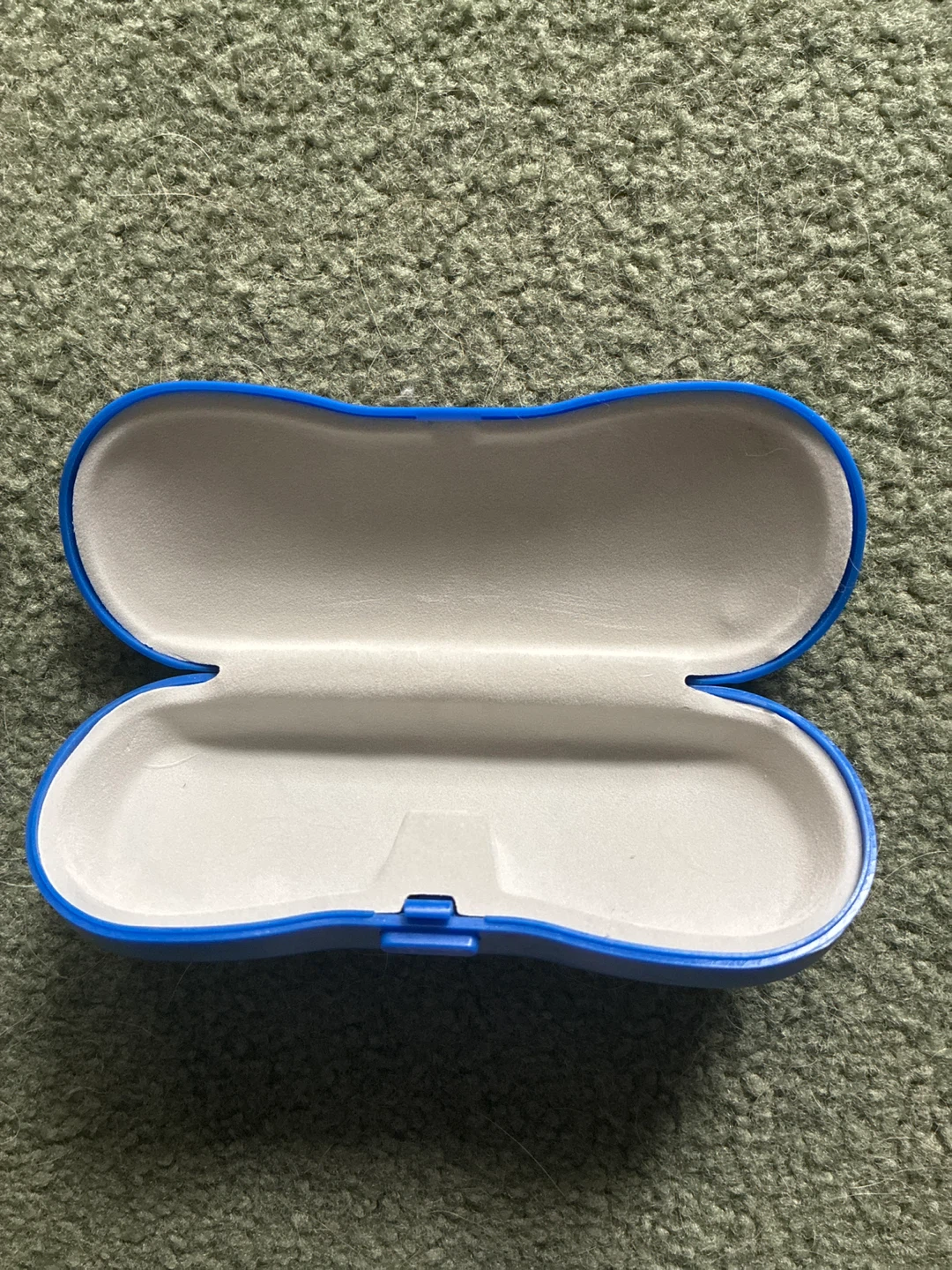Blue hard shell eyeglass case. Interior is lined with soft material. Case has a secure clasp closure. Protects your glasses from scratches and damage.