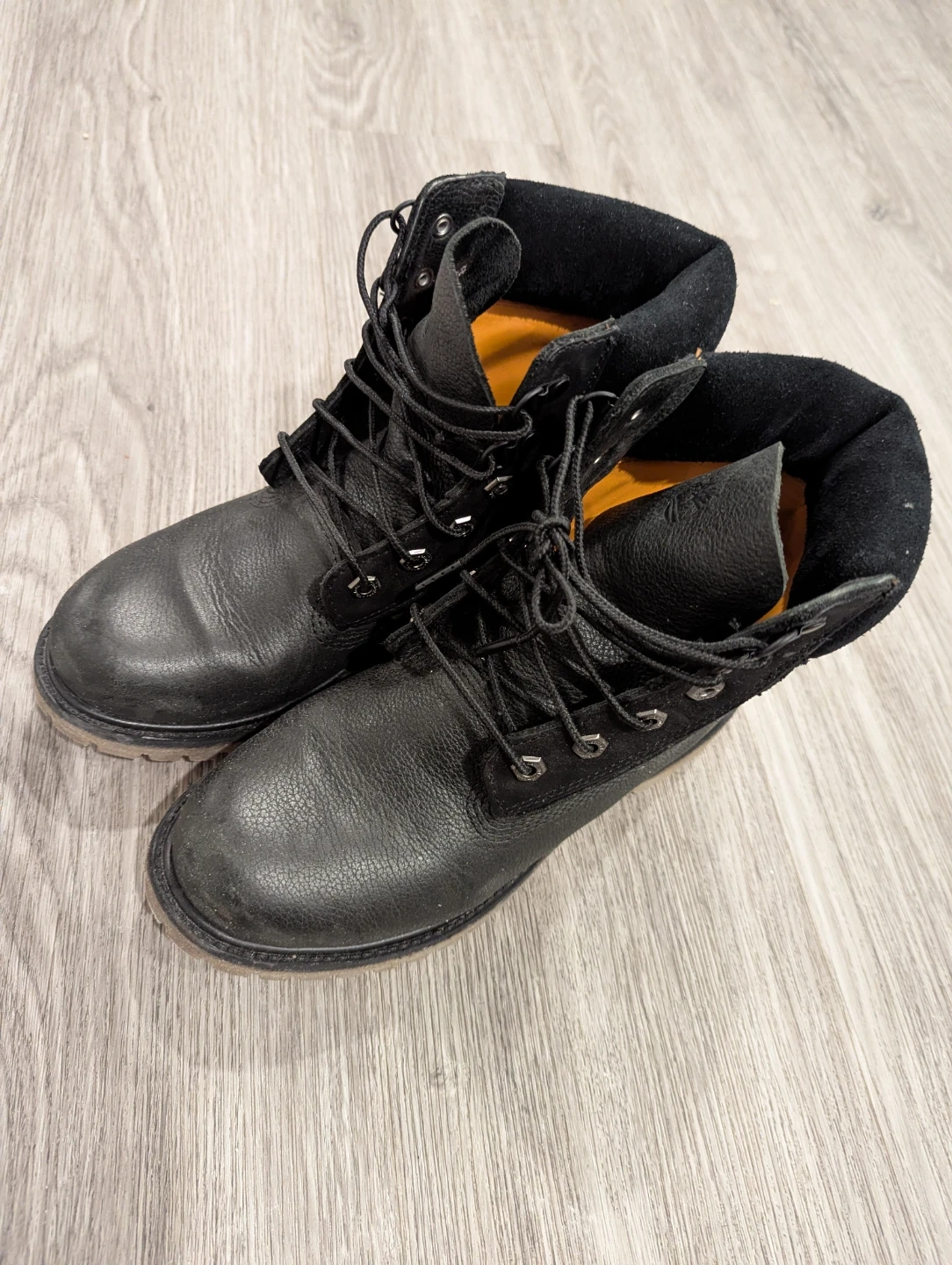 Classic black leather lace-up boots from Timberland. These boots are designed for durability and comfort. Features a sturdy sole and lace-up closure for a secure fit.