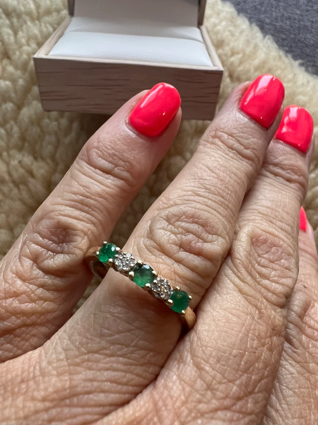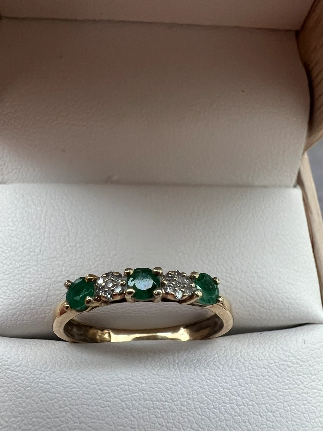 Here's a beautiful 10 k gold ring featuring emeralds and diamonds. It comes with its box, making it perfect as a gift or a special treat for yourself