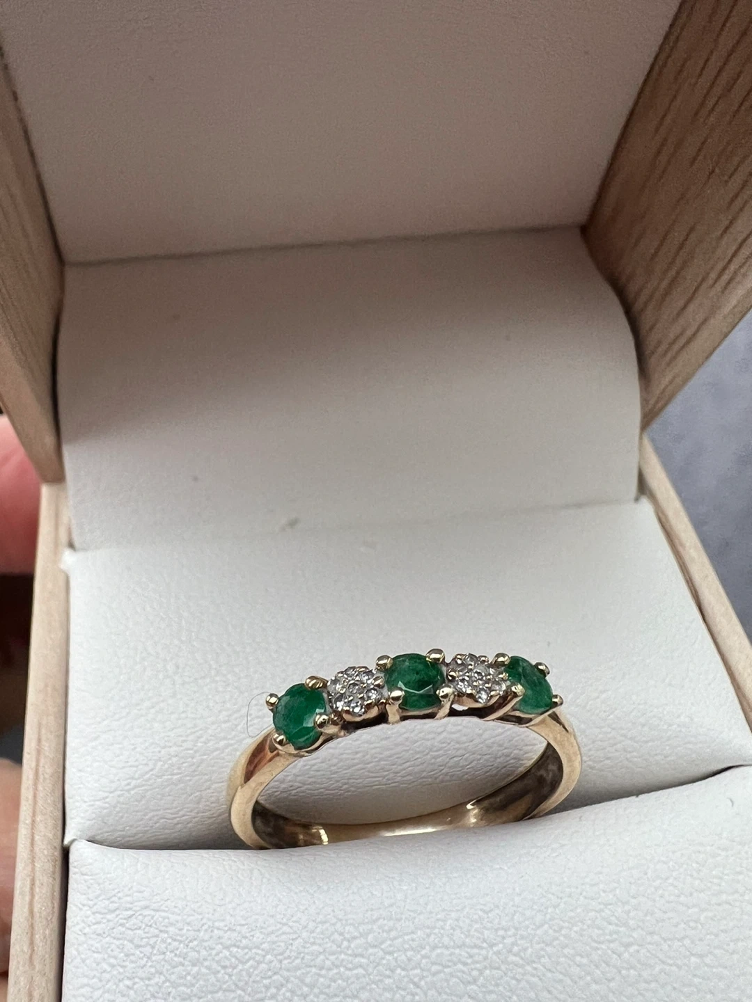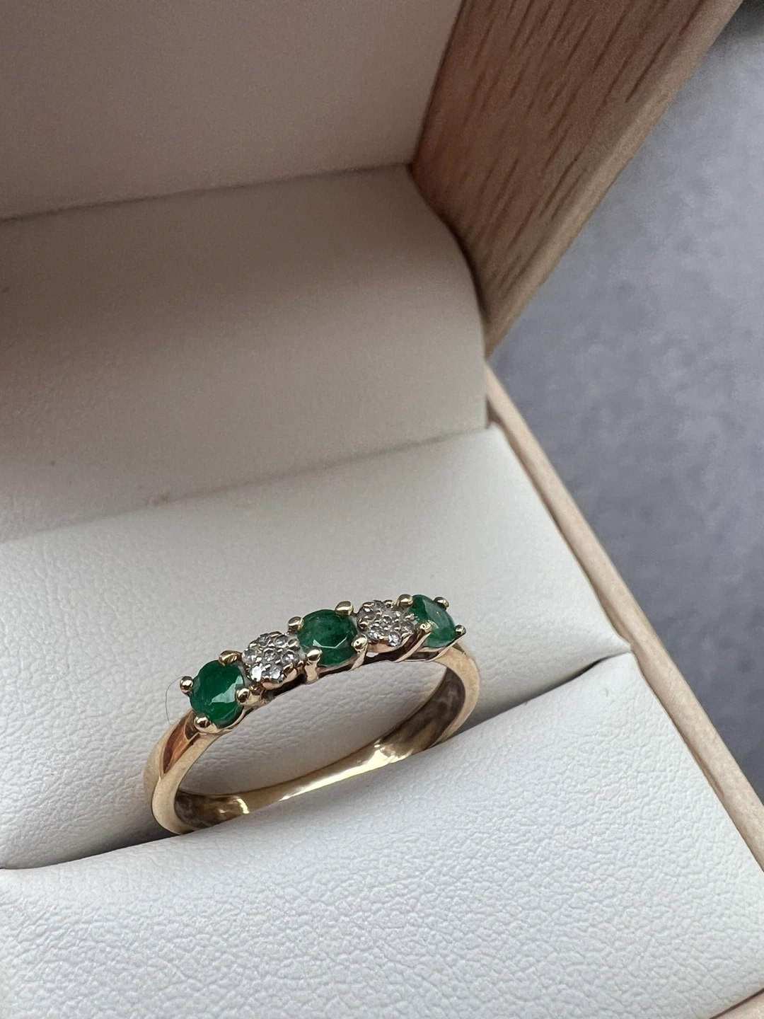 Here's a beautiful 10 k gold ring featuring emeralds and diamonds. It comes with its box, making it perfect as a gift or a special treat for yourself