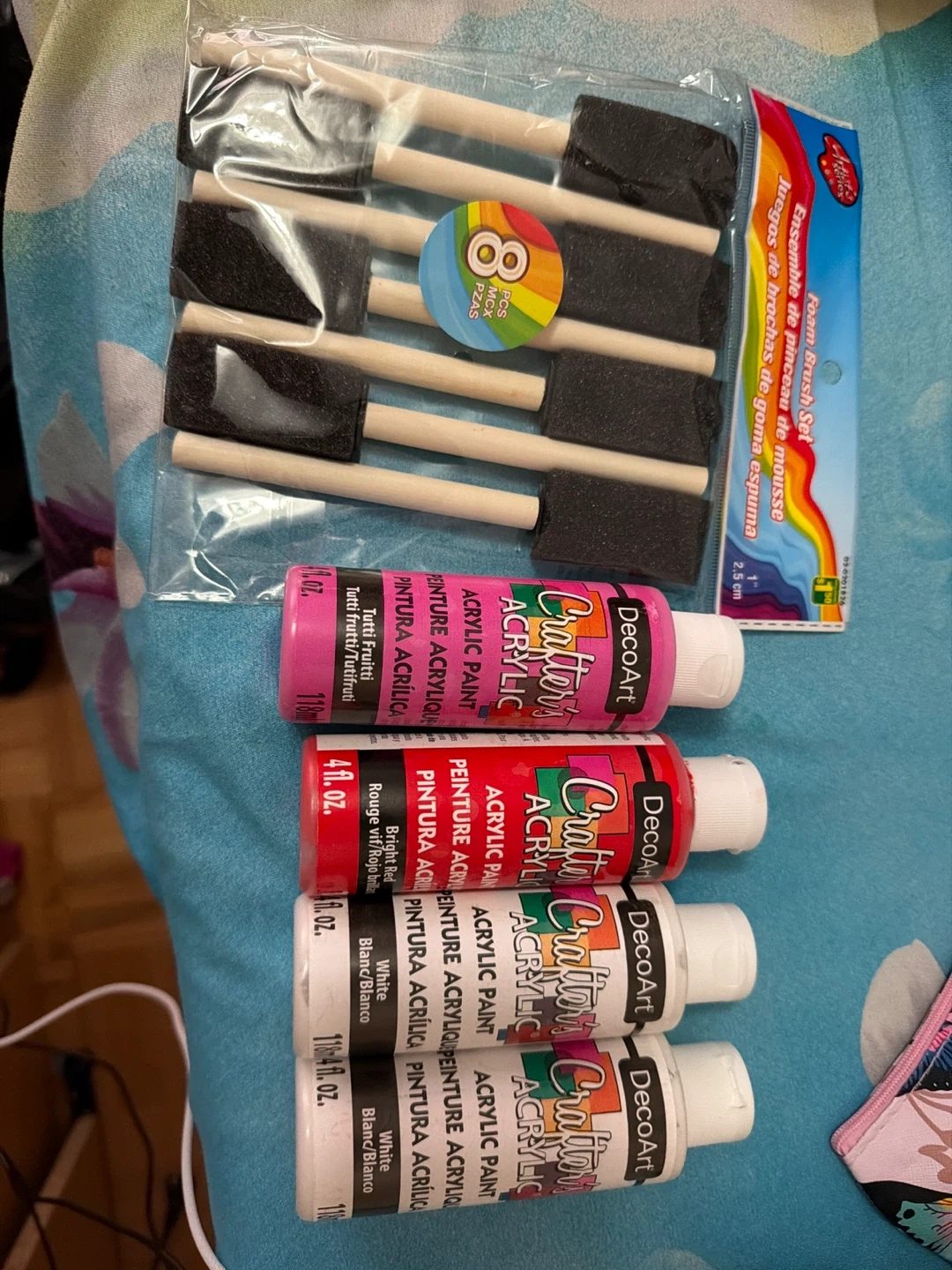 Includes 4 bottles of DecoArt acrylic paint in Tutti Frutti, Bright Red, and two Whites. Also comes with a set of 7 foam brushes, 1" size. Great for various craft projects!