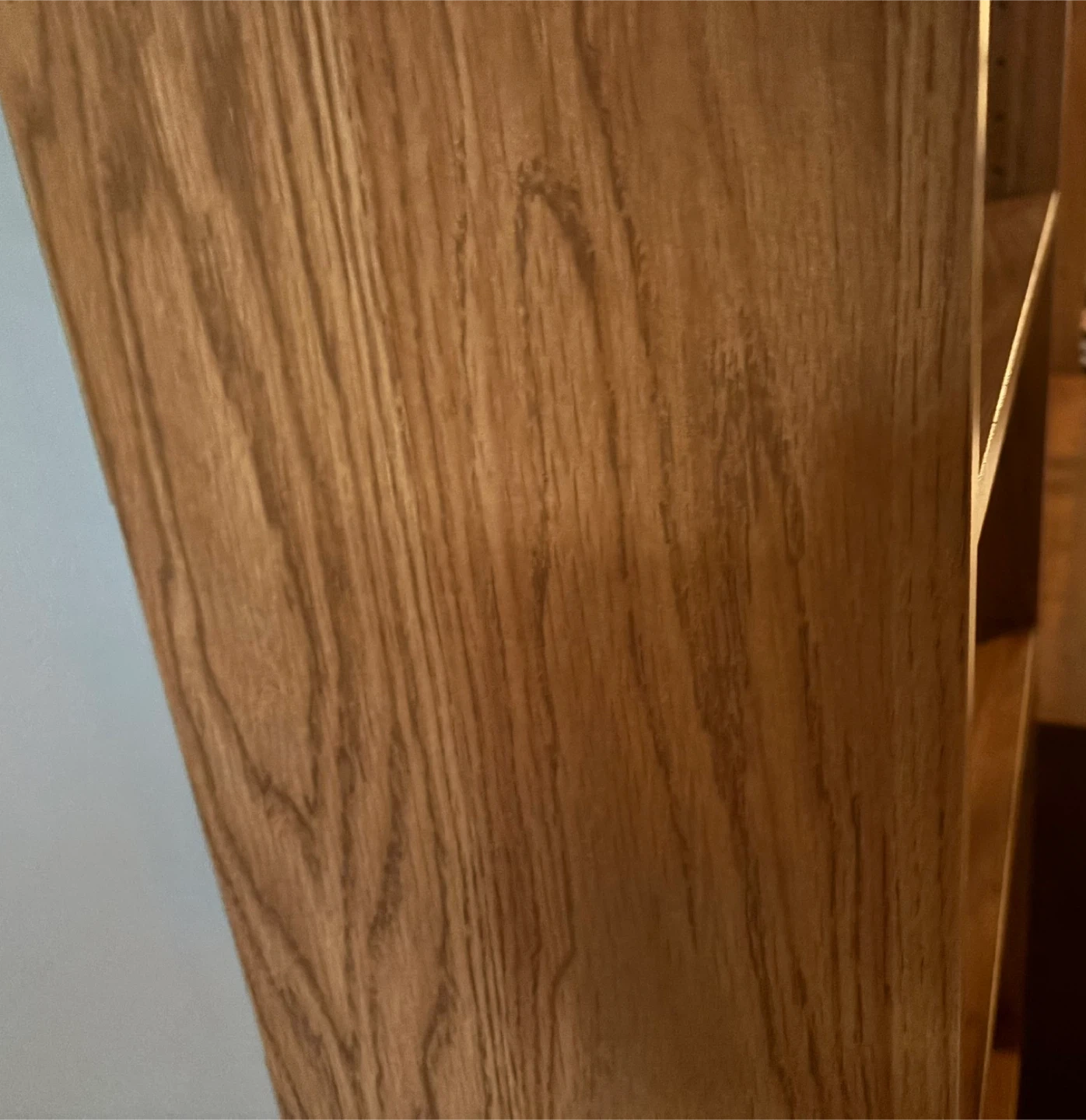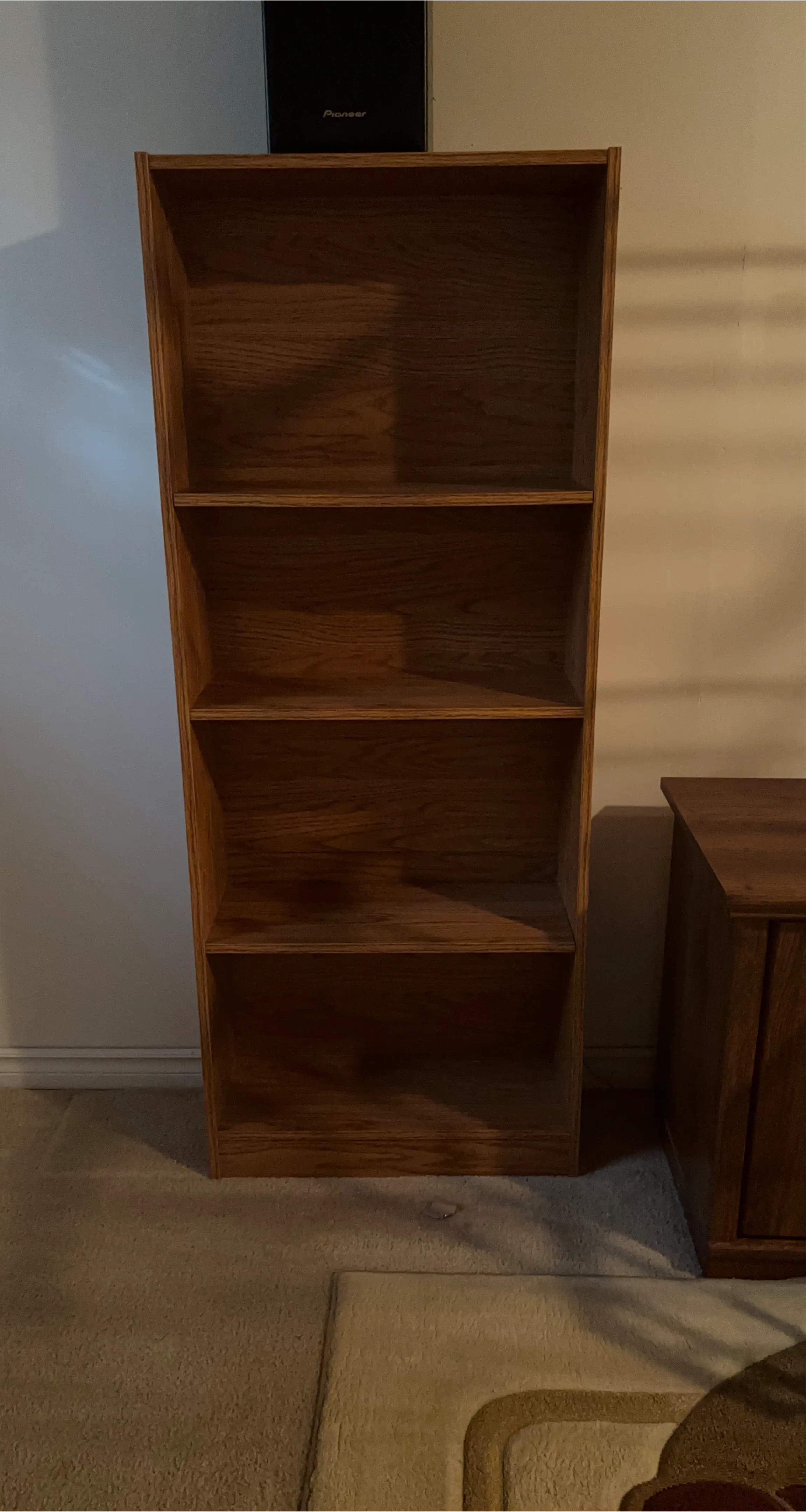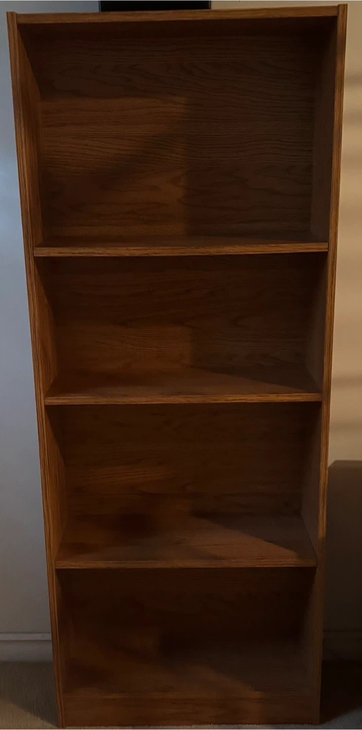 This is a sturdy, four-shelf bookshelf made from solid wood with a warm oak finish. It's a great storage solution for books, decor, or any other items. Oak wood construction. Four shelves.
