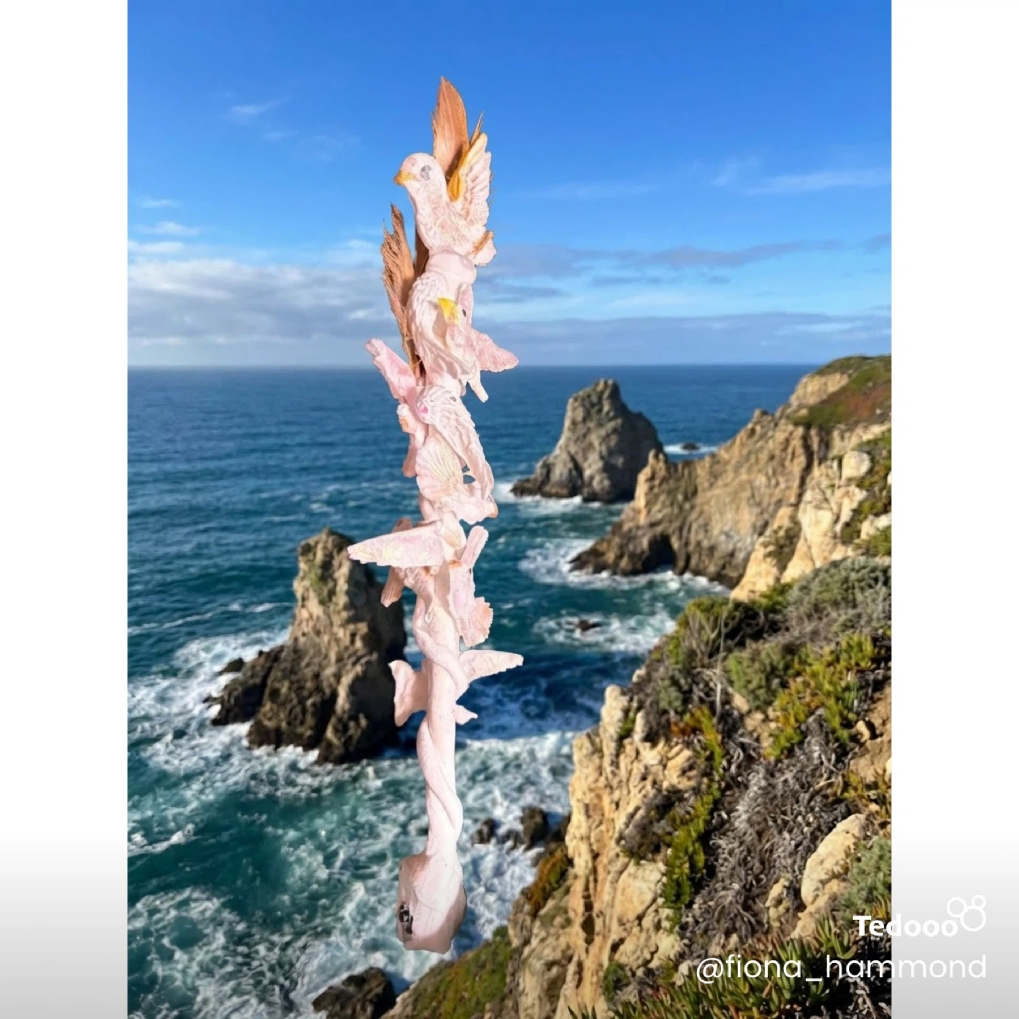 This unique wand features delicate pink birds climbing a twisted branch, topped with a soft feather. It's a lovely decorative piece for any shelf or desk. The craftsmanship is evident in the detailed sculpting of the birds and their playful arrangement. This item would add a whimsical touch to your home decor or can be fun at a party, parade or festival.