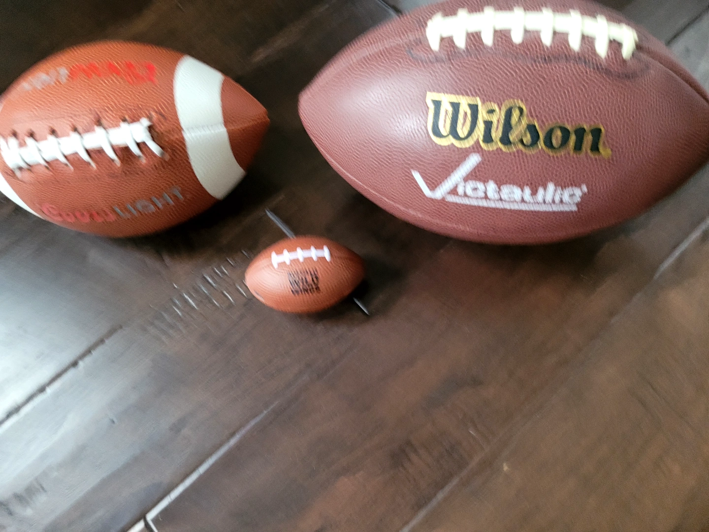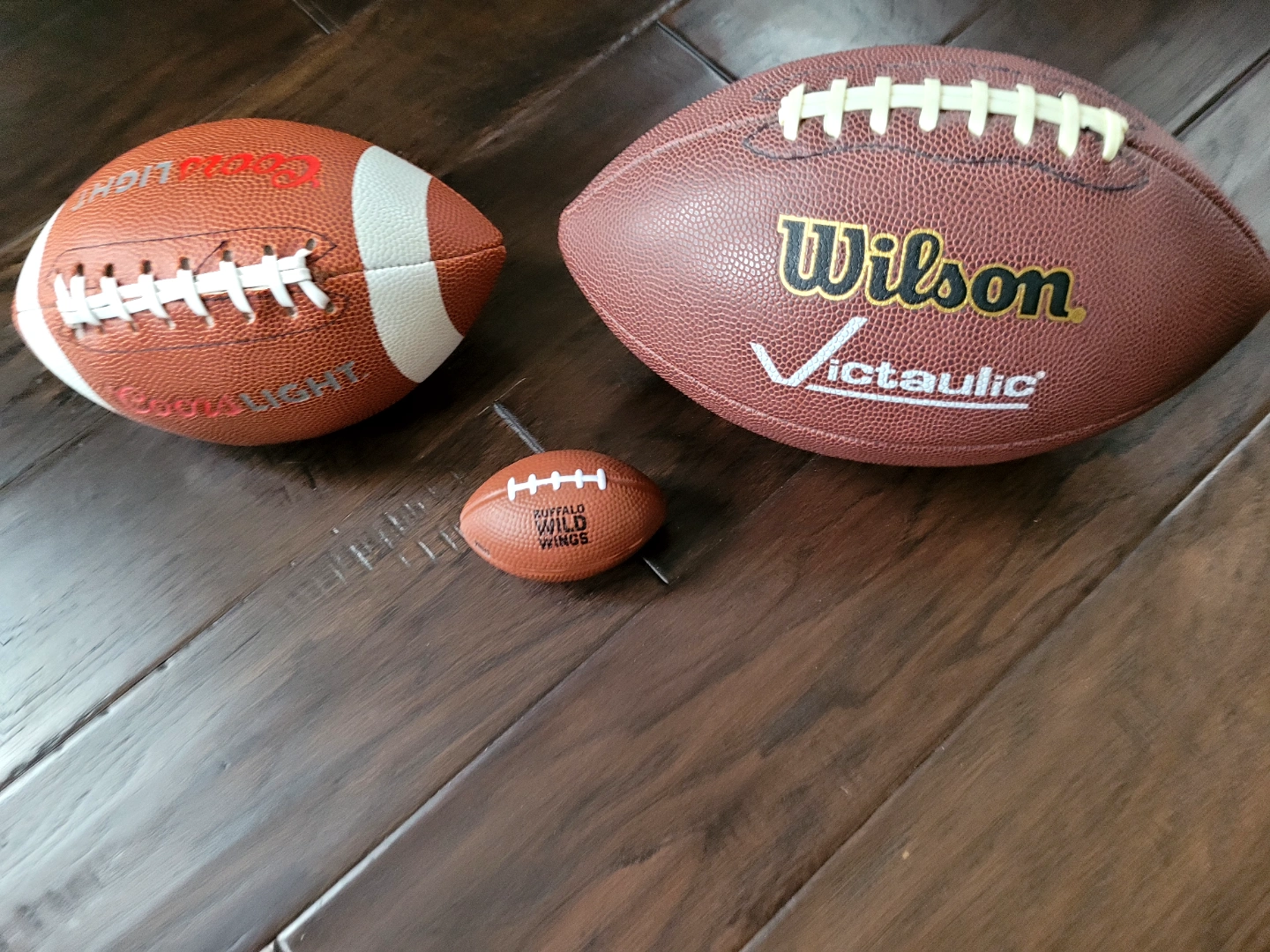 Three footballs, varying sizes. One Wilson Victaulic football. One smaller football. One tiny Buffalo Wild Wings football. Great for collectors or players.
