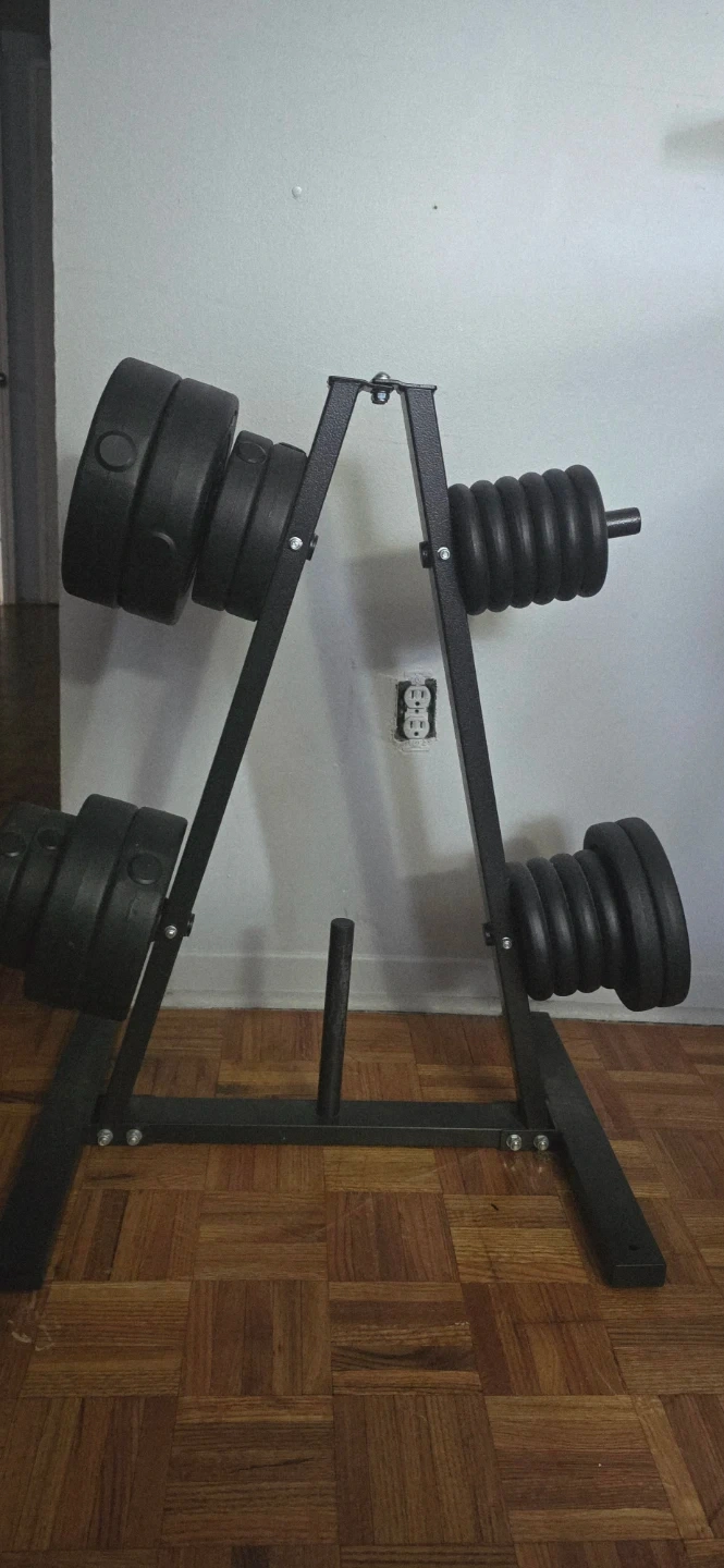 This set includes adjustable dumbbells on a storage rack. The weights are marked in lbs, with some plates reading 2lbs, 5 lbs and others 10 lbs. It's great for home gyms and can be used for a variety of exercises.