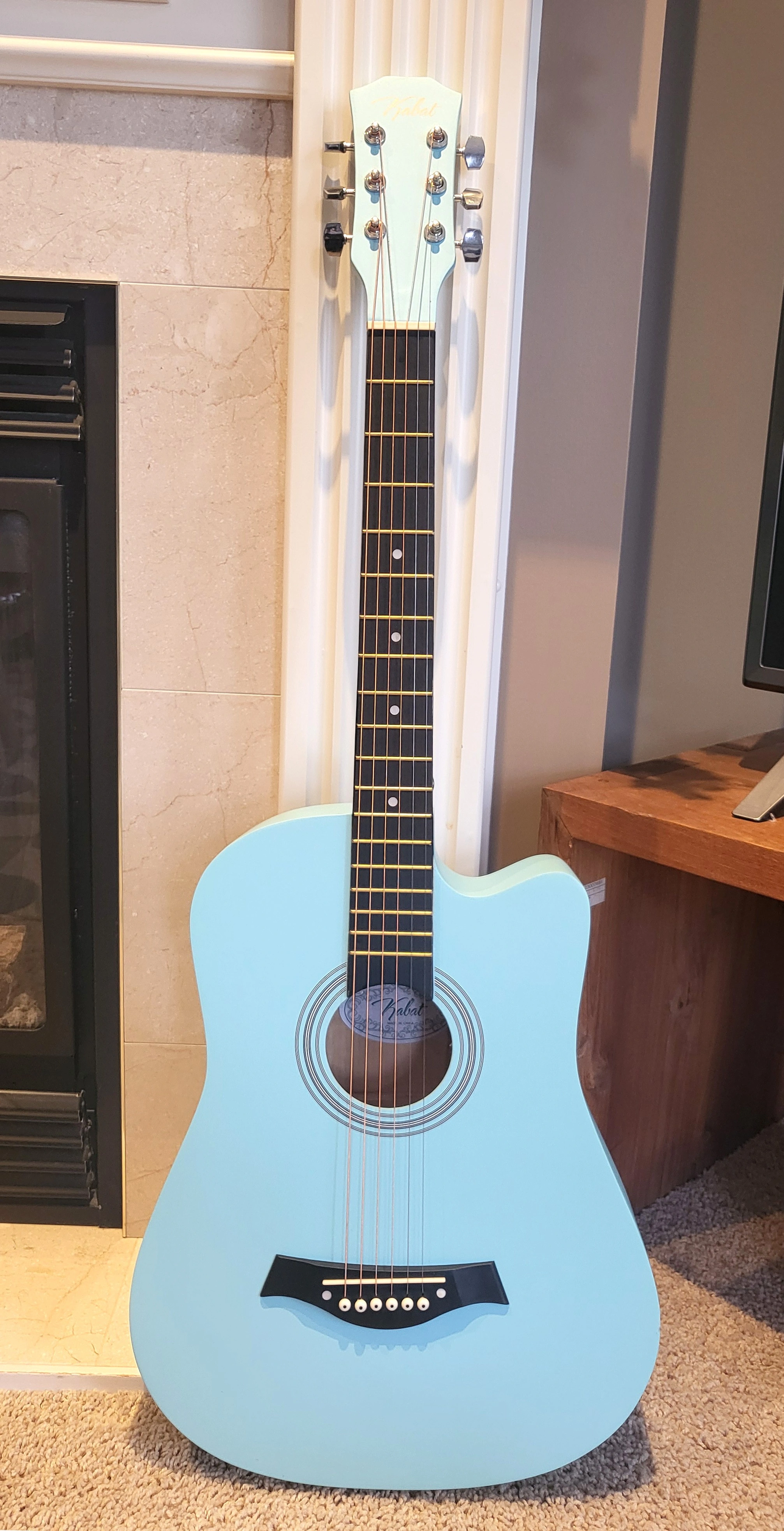 Beautiful light blue acoustic guitar in excellent condition. This guitar is ideal for beginners or casual players, offering a comfortable feel and great sound quality.