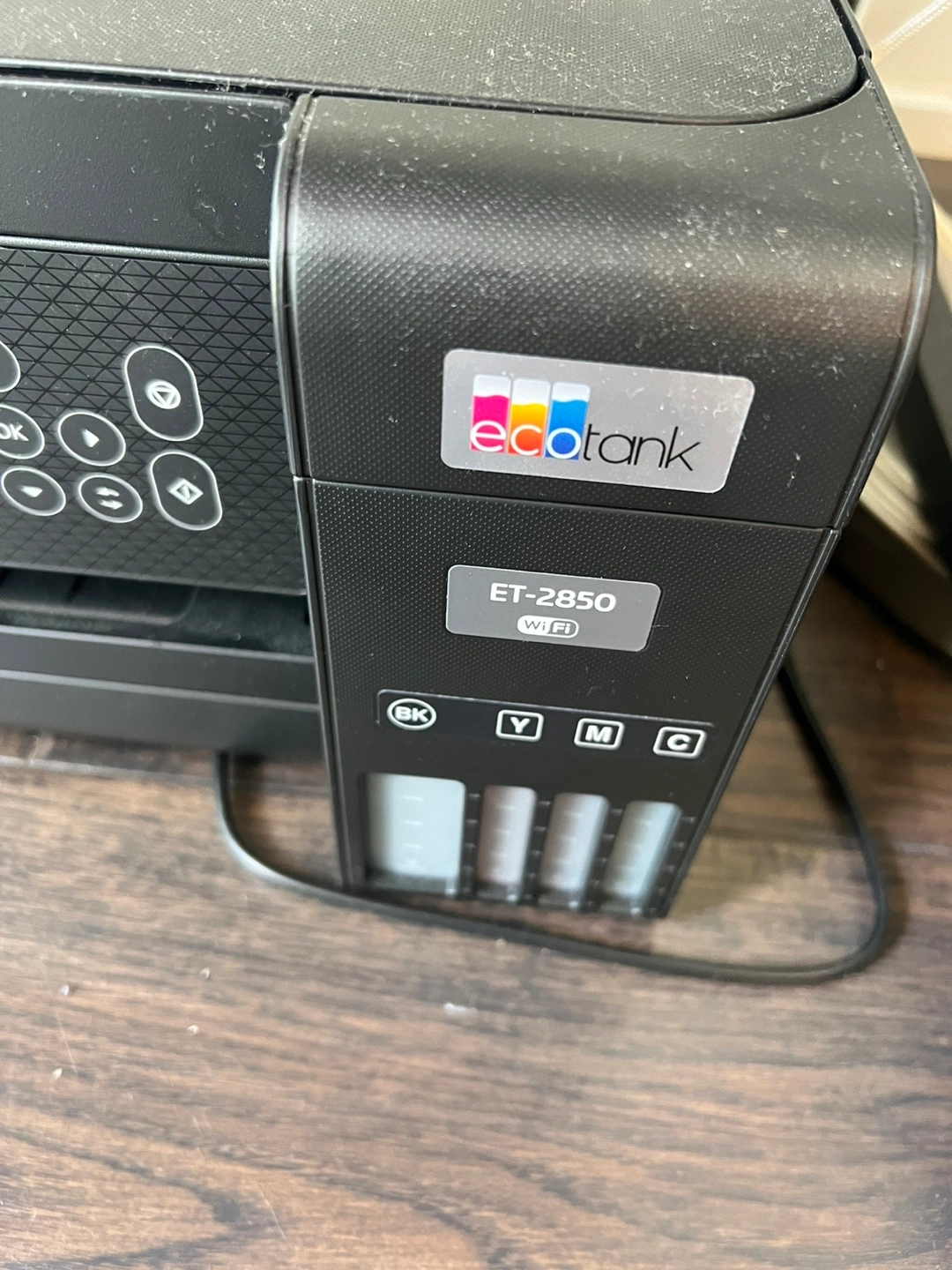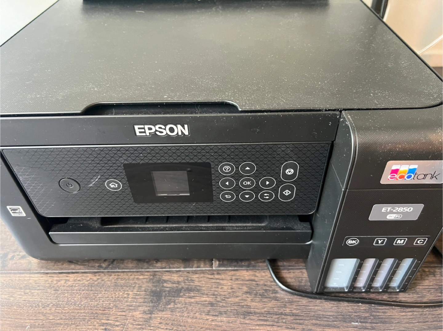 Black printer. Features control buttons, and a small screen. Has ink tanks. It would be perfect for someone looking to start a new at-home hobby or business.