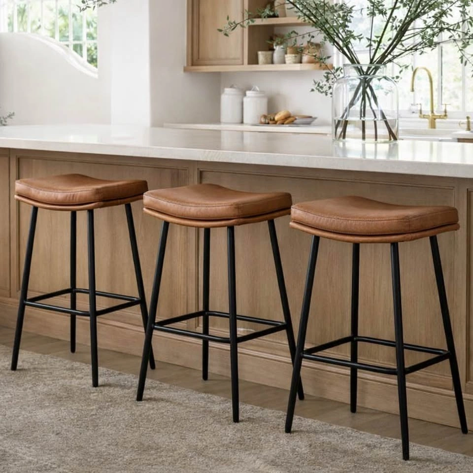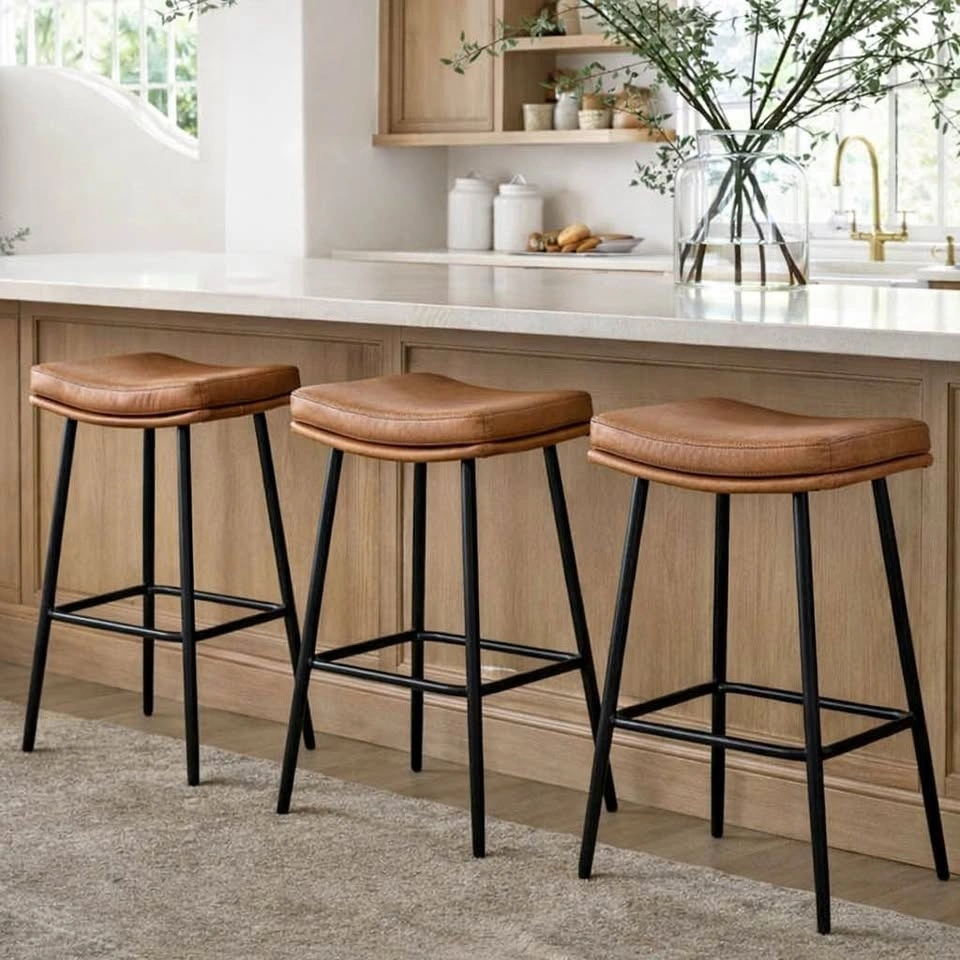 Set of 3 brand new vegan leather counter height saddle stools in a versatile camel colour. The price is for the set of 3.