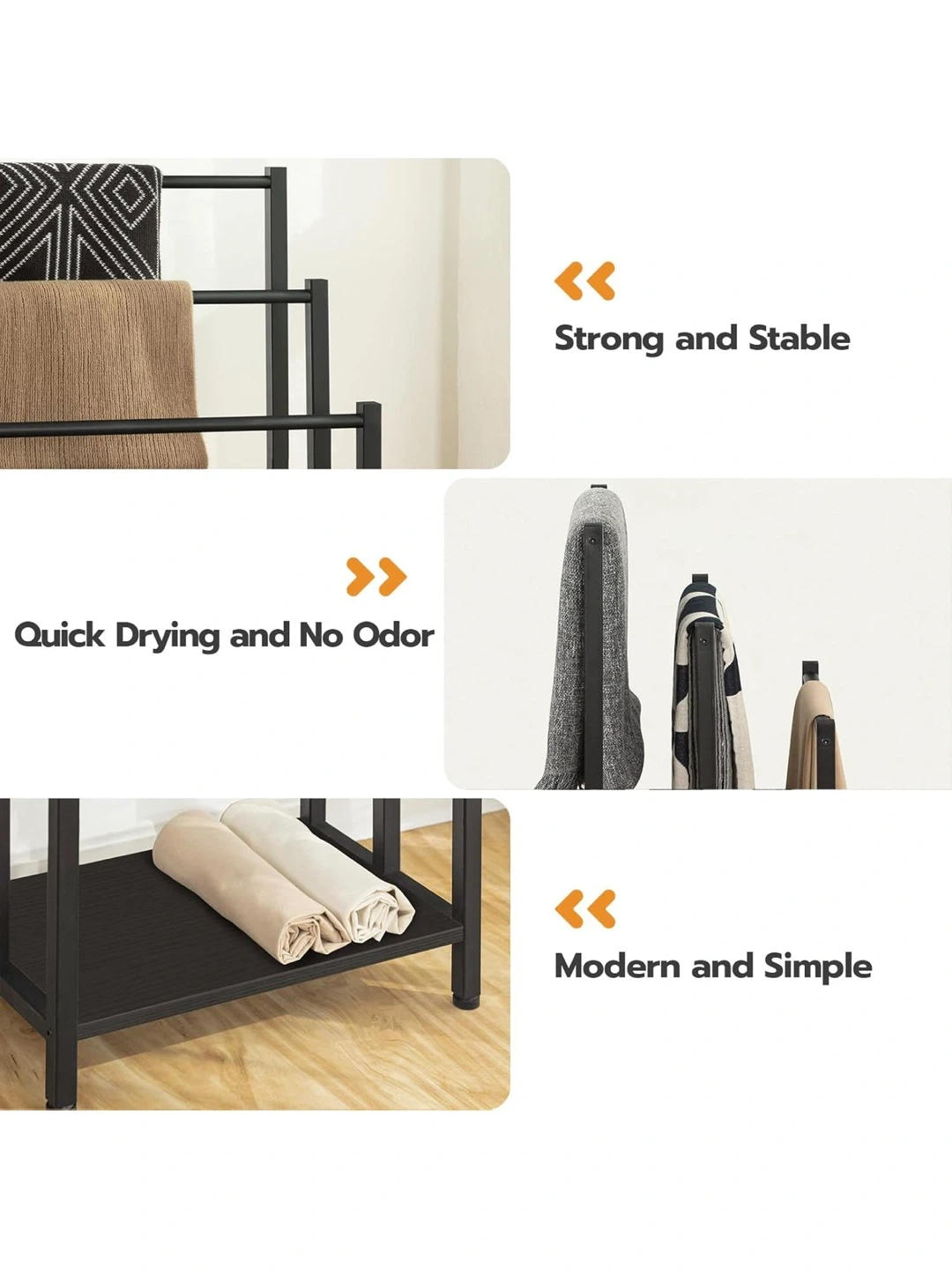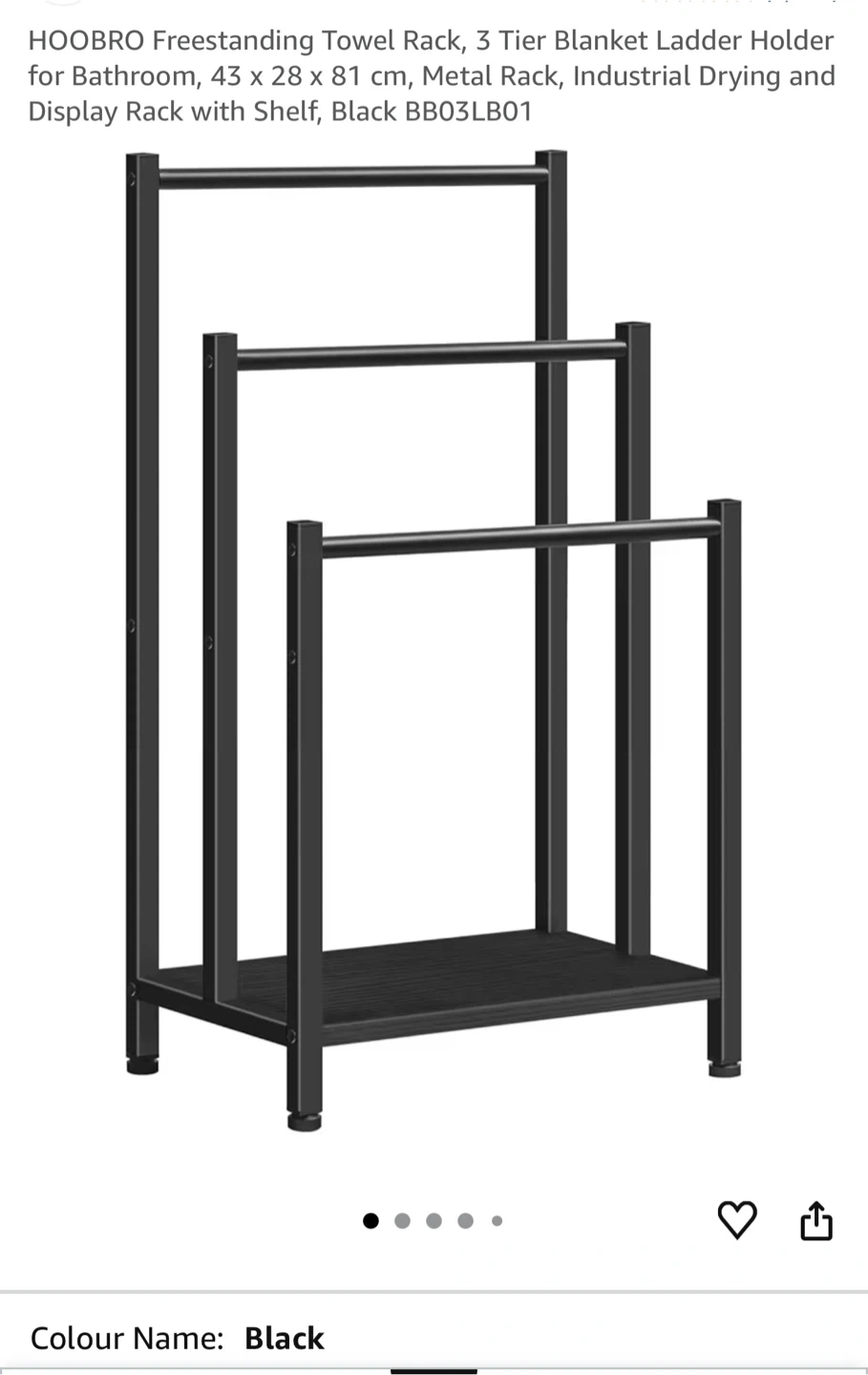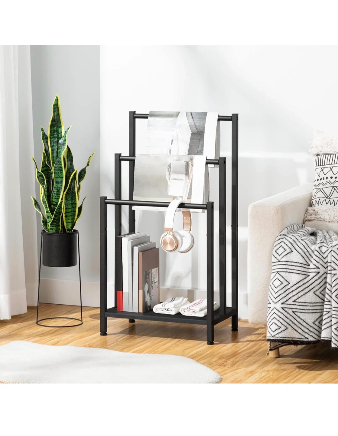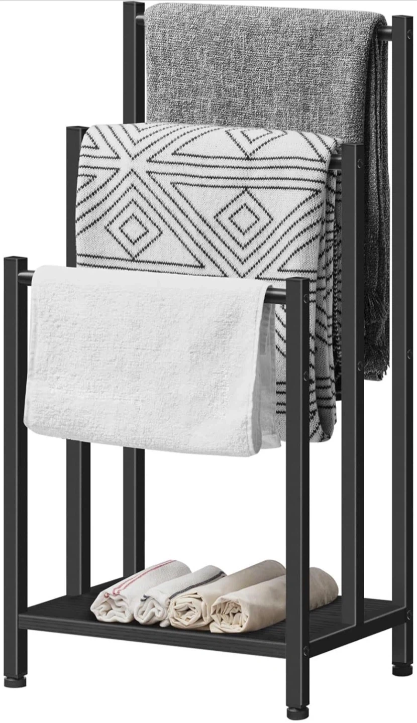 This HOOBRO towel rack features three tiers for hanging blankets or towels. It's made of black metal and includes a bottom shelf for extra storage. Dimensions are 43 x 28 x 81 cm.