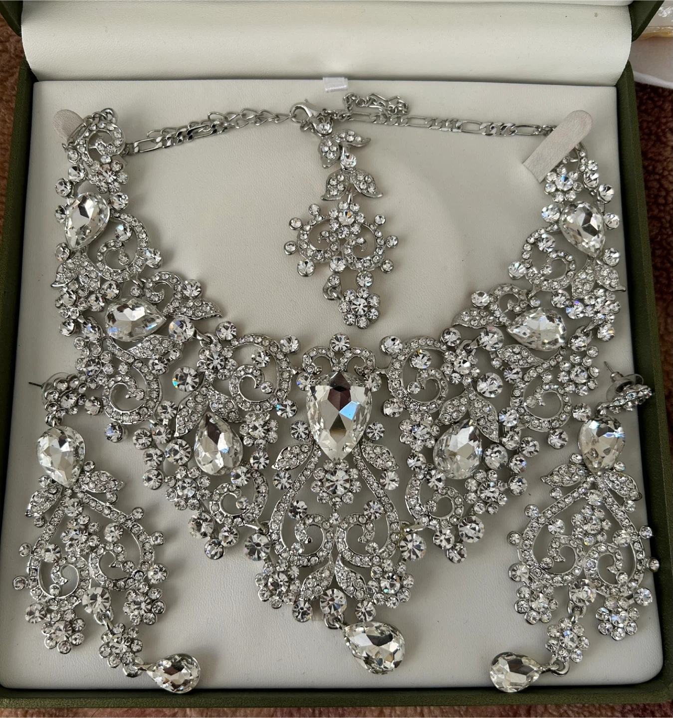 Selling a beautiful rhinestone jewellery set, perfect for a special occasion! Includes a necklace, earrings, and a headpiece, all in excellent condition and ready to add some sparkle to your look