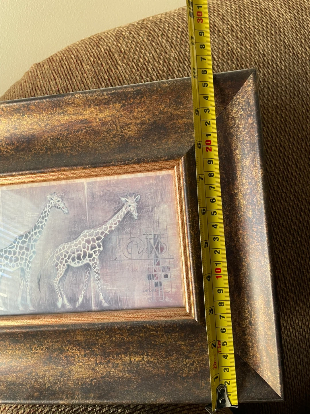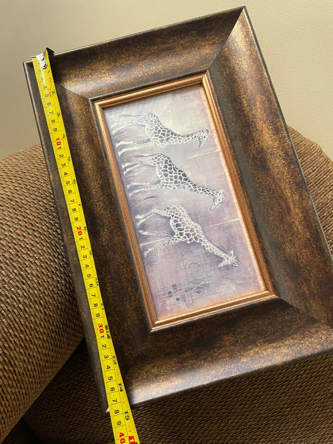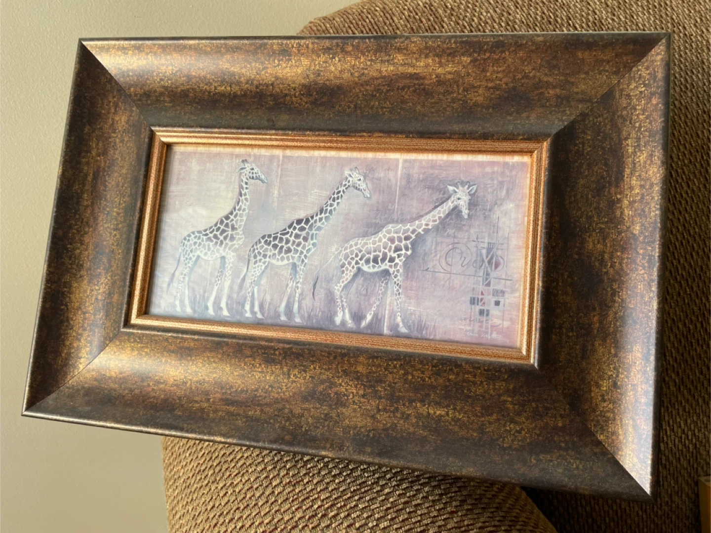Framed print featuring three giraffes by Elaine Vollherbst. This piece is framed in a dark bronze-coloured frame with a distressed finish. It's made in Canada.