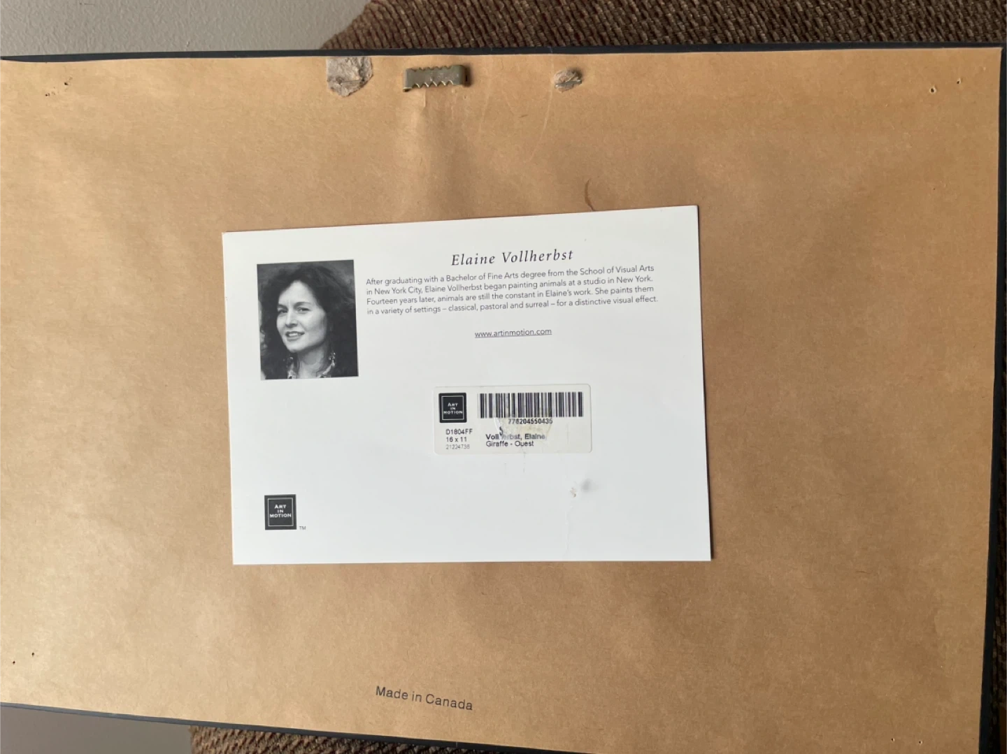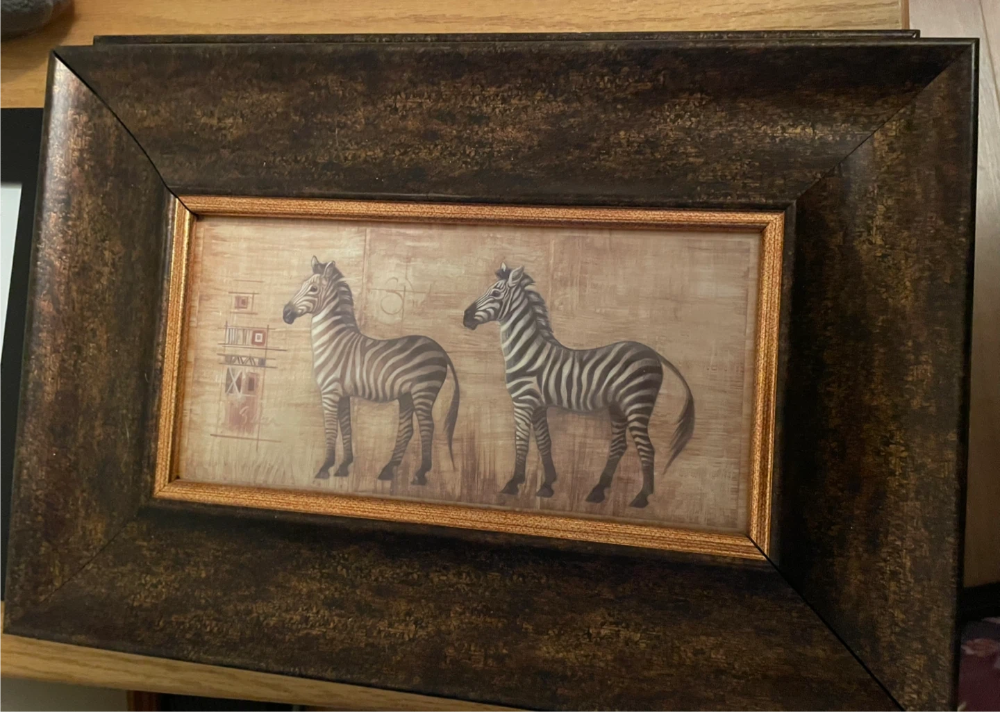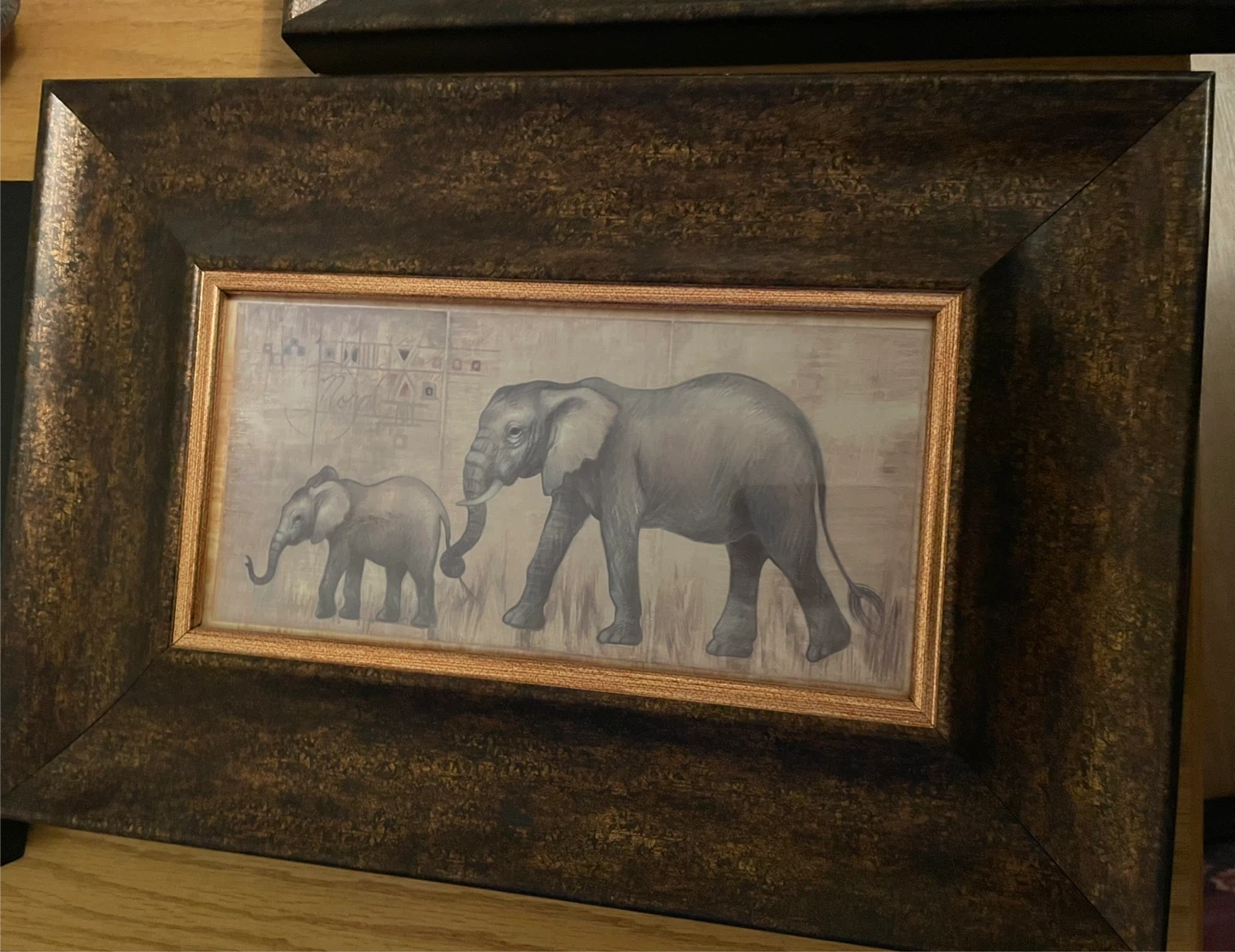 Framed print featuring three giraffes by Elaine Vollherbst. This piece is framed in a dark bronze-coloured frame with a distressed finish. It's made in Canada.