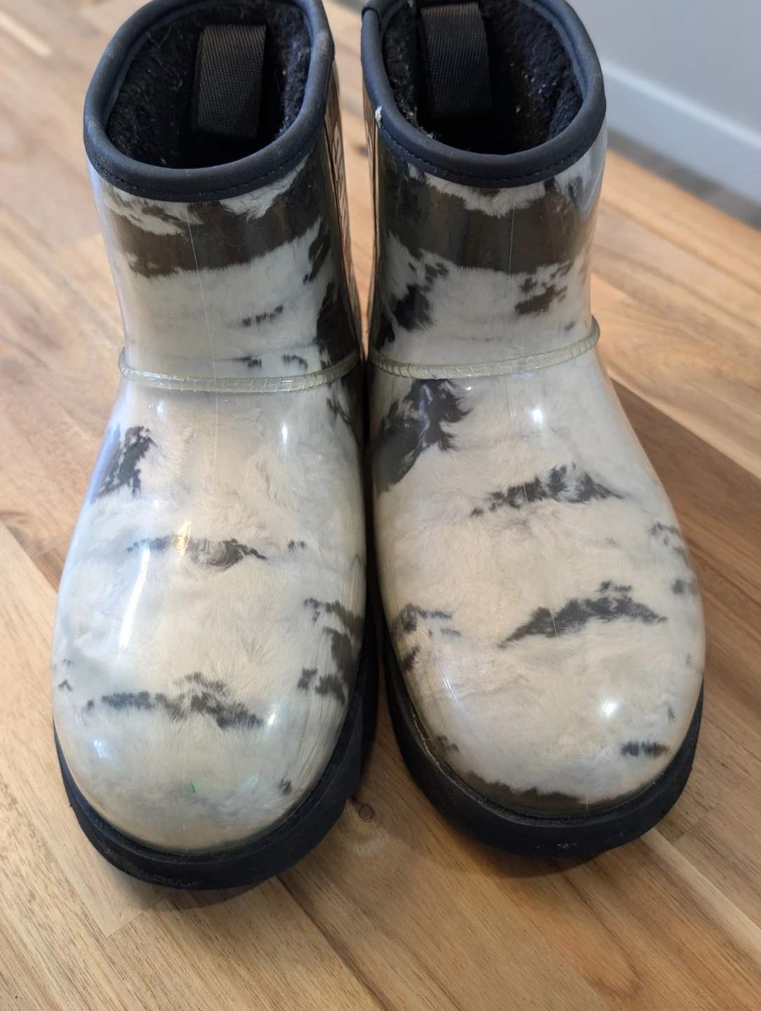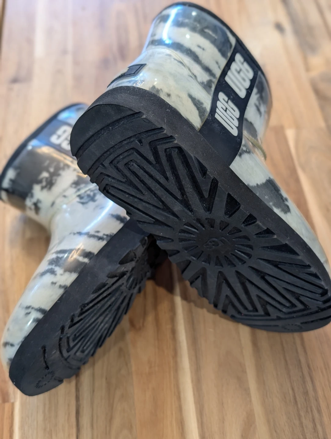 These UGG boots were only worn a couple times. The tread and sole are like Brand New! These UGG boots are waterproof and feature a clear outer shell with a black and white pattern. They have the UGG logo on the side and heel. The interior is lined for warmth.