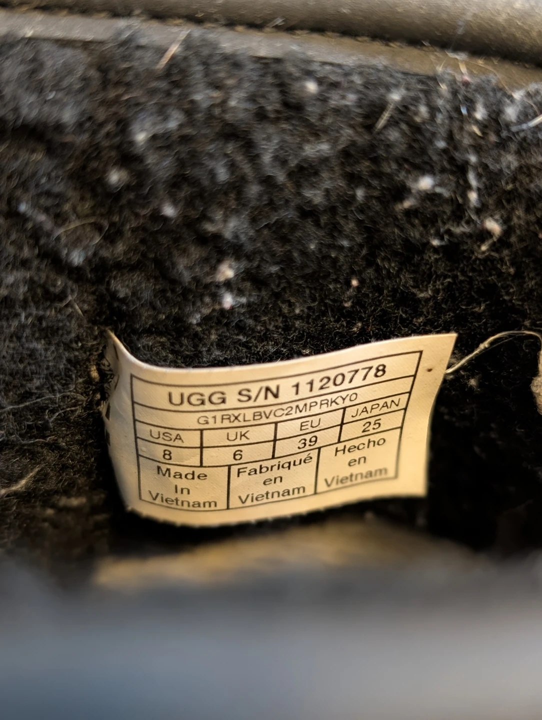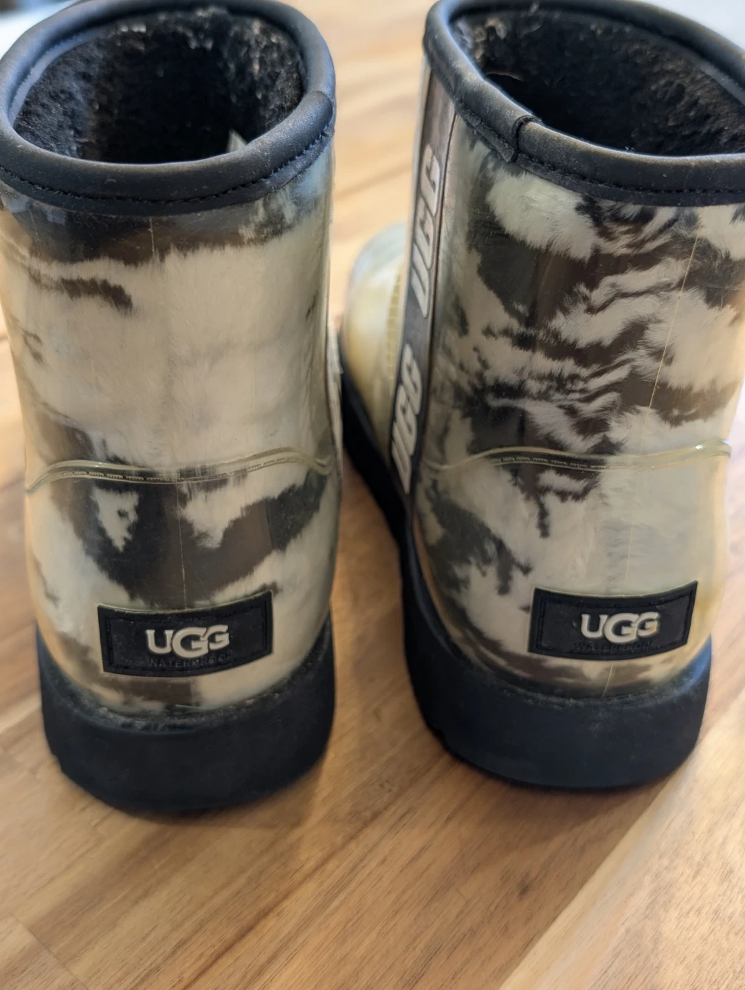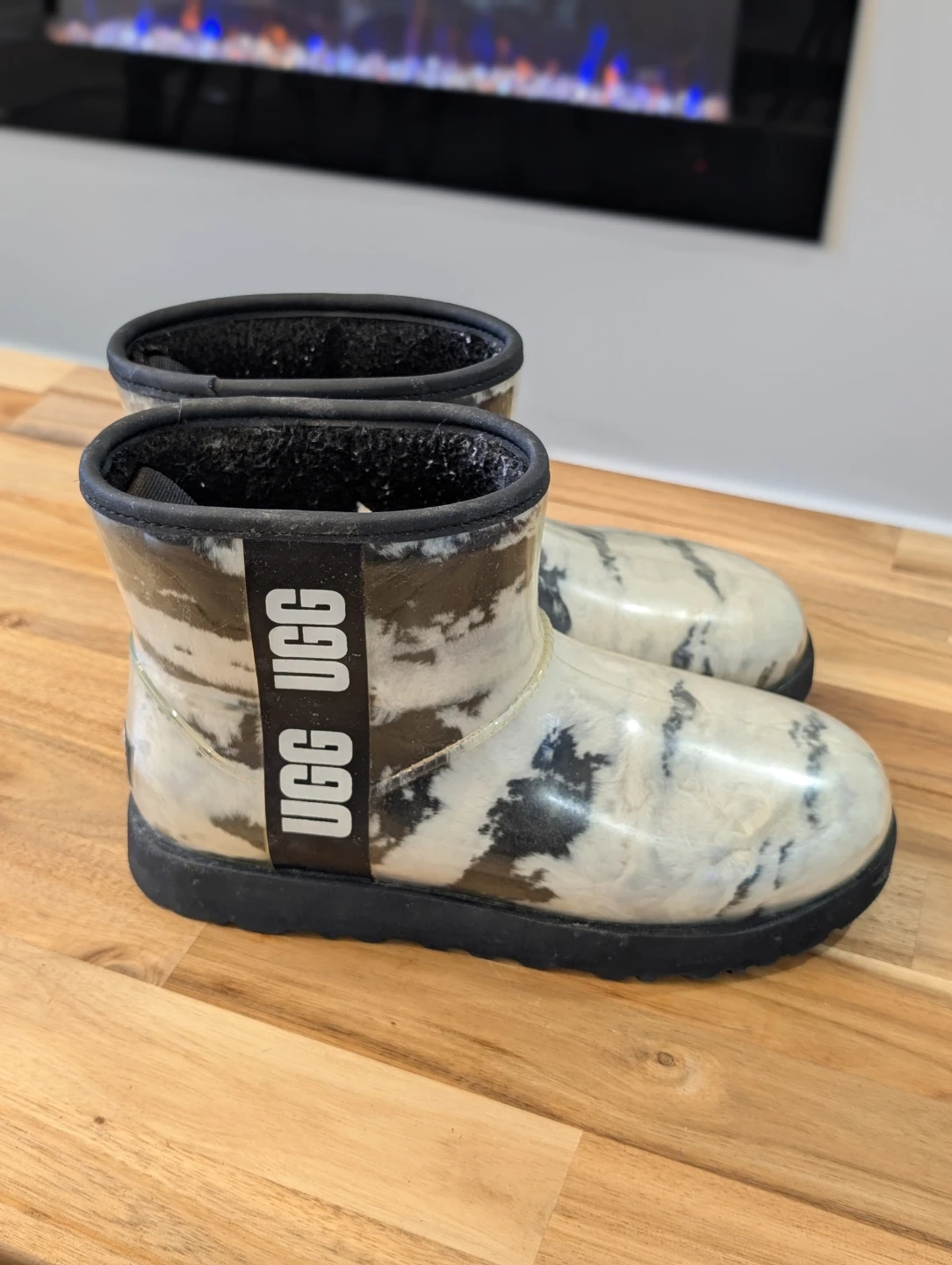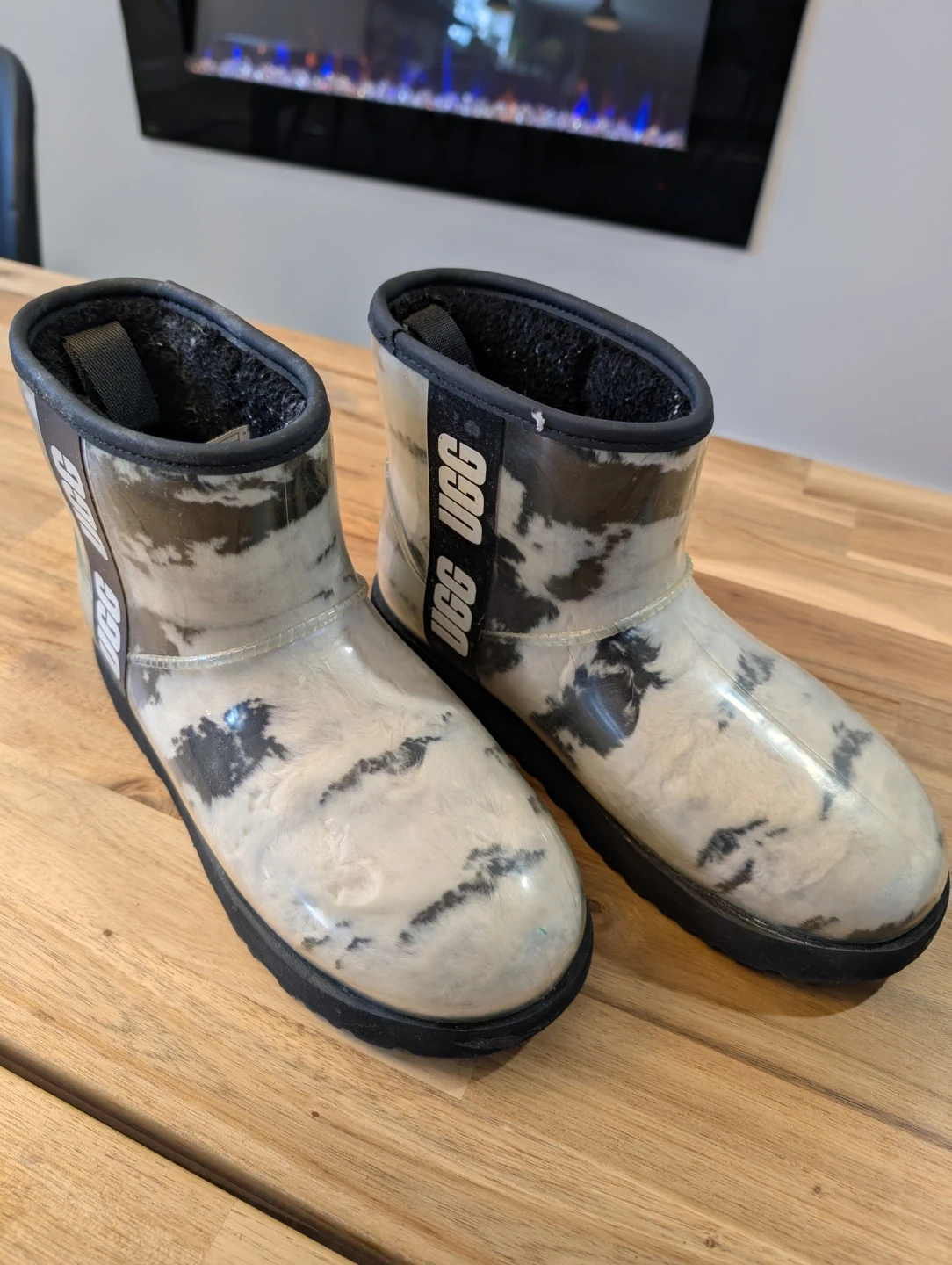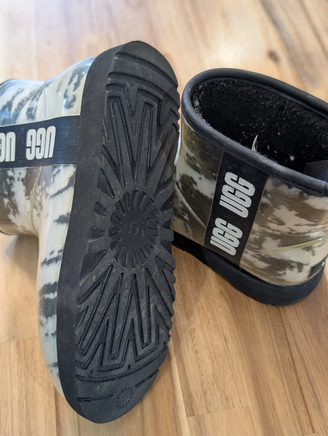 These UGG boots were only worn a couple times. The tread and sole are like Brand New! These UGG boots are waterproof and feature a clear outer shell with a black and white pattern. They have the UGG logo on the side and heel. The interior is lined for warmth.