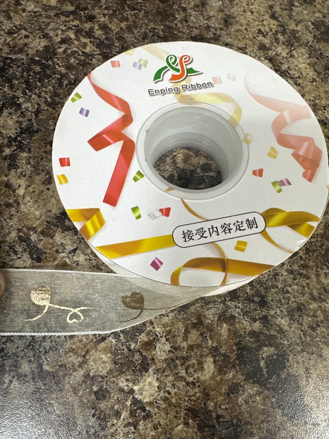This is a roll of Empiing Ribbon with a lovely gold heart design. It's great for gift wrapping, crafts, or decorating any occasion. The ribbon is a shimmery, light gold colour.