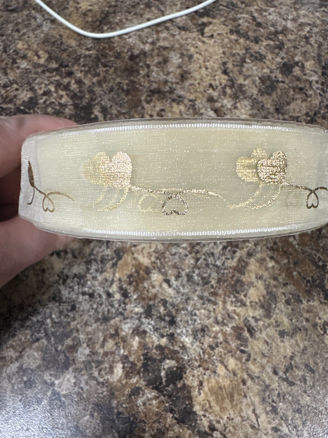 This is a roll of Empiing Ribbon with a lovely gold heart design. It's great for gift wrapping, crafts, or decorating any occasion. The ribbon is a shimmery, light gold colour.