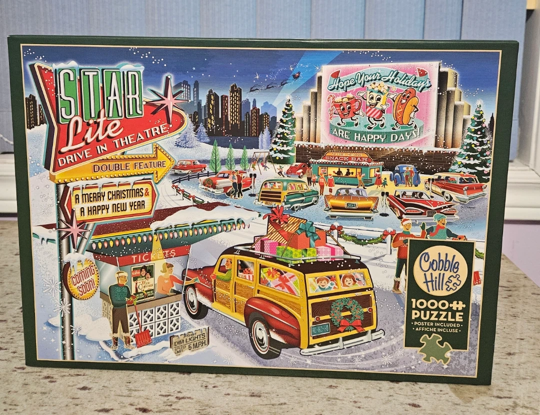 This Cobble Hill puzzle depicts the Star Lite Drive-In Theatre scene with a retro holiday theme. It includes a poster for assistance during assembly. This 1000+ piece puzzle is great for a fun challenge during the winter months.