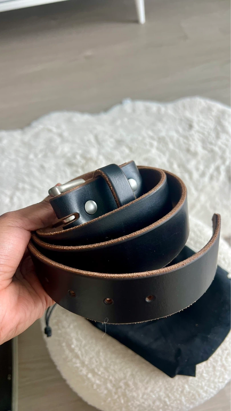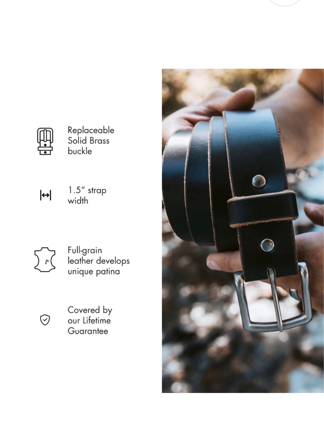 This is a Popov Leather belt with a 1.5" strap width. It's made from full-grain leather that develops a unique patina. The buckle is solid brass and replaceable.