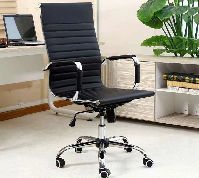 High-back executive chair. Features adjustable height, comfortable cushioned seat, and rolling casters. Modern design, ideal for home or office.
