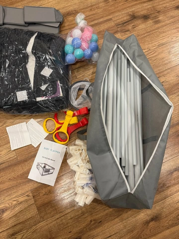 Large play area (75"x59") provides ample space for babies and can accommodate up to 3 adults and 3 infants. Includes 30 Ocean Balls, 1 Net Basket, 4 Handle Rings, and 1 King Size Folding Mat for extra entertainment. Also comes with 1 hanging accessory bag and 1 oversized organizer. The hanging bag is great for keeping necessities handy, and the storage bag makes it convenient for outdoor use. The fabric is thicker to prevent tearing, and the stainless steel casing edges are smooth to avoid scratches. The folding mat has a soft, breathable polyethylene fiber lining for comfort. Zippers are made of high-strength composite material for durability. Features 4 non-slip suction cups on the bottom for stability on smooth floors, preventing sliding and tipping. Visible ventilation nets on all sides allow for easy observation of the baby. The mat quickly absorbs liquid spills. The playpen fabric, storage bag, and mat are machine or hand washable and won't shrink or fade.