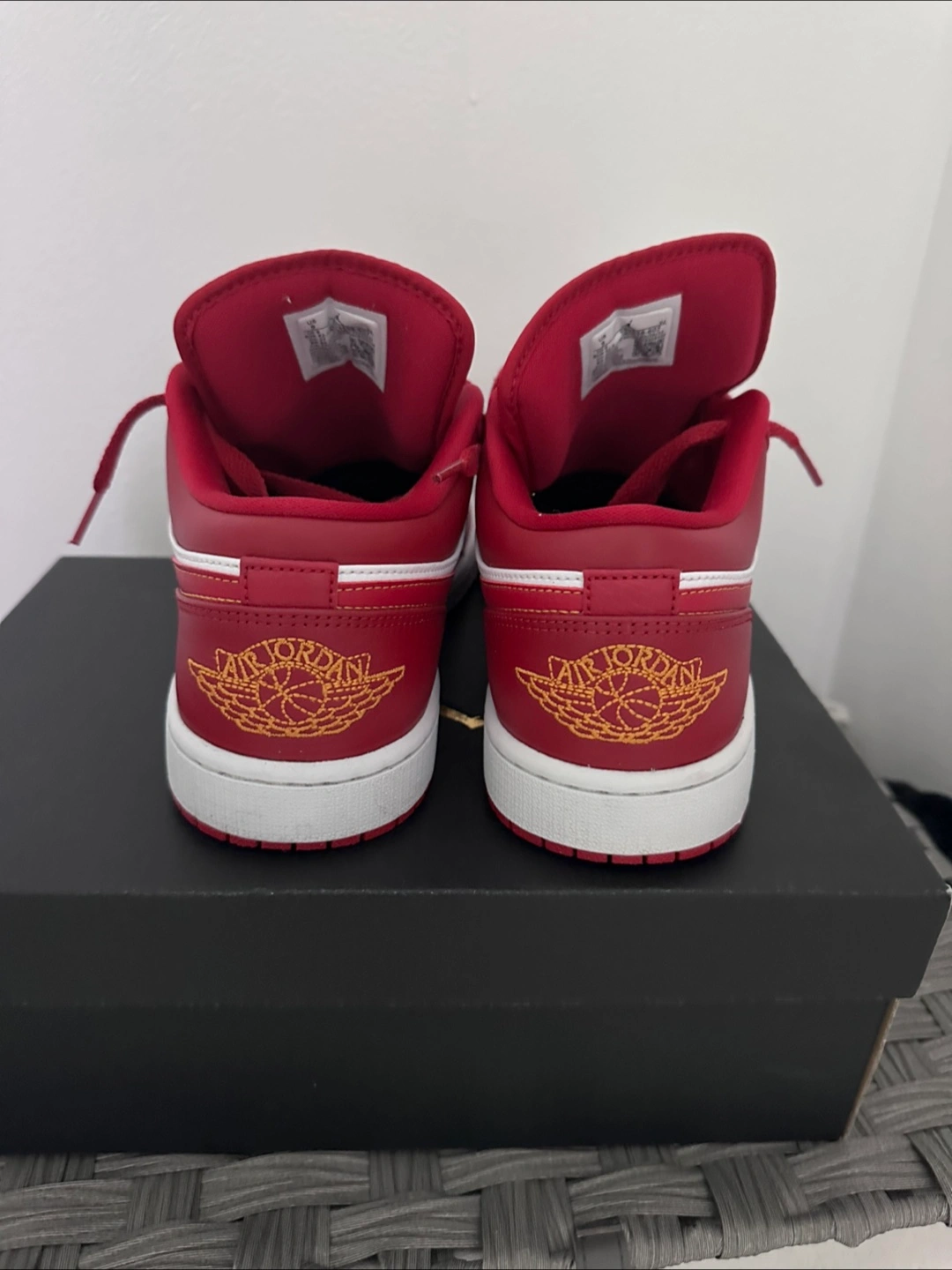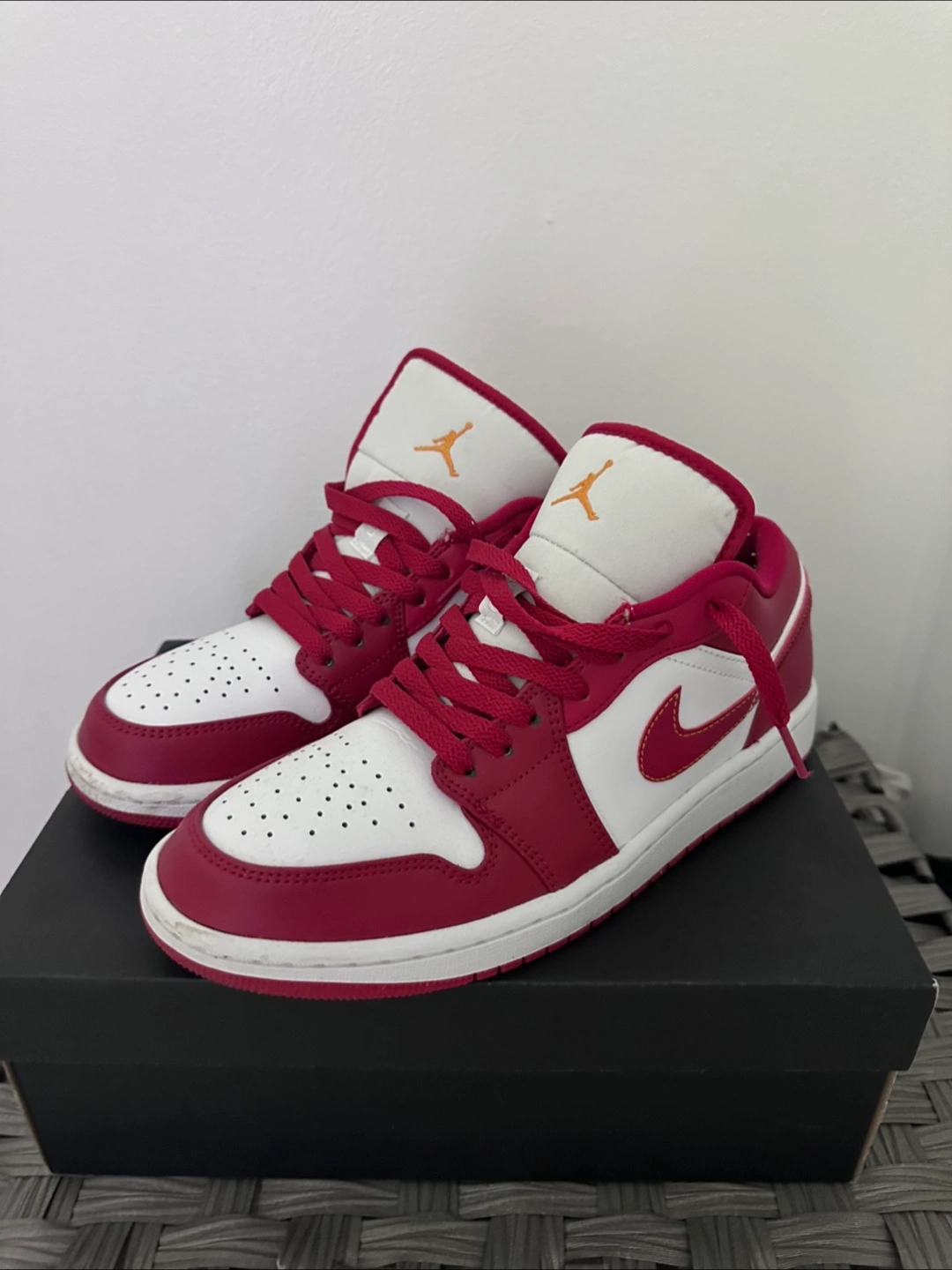 Selling a pair of Air Jordan 1 Low sneakers in red and white, size 8.5. They come with the original box. Great for everyday wear!