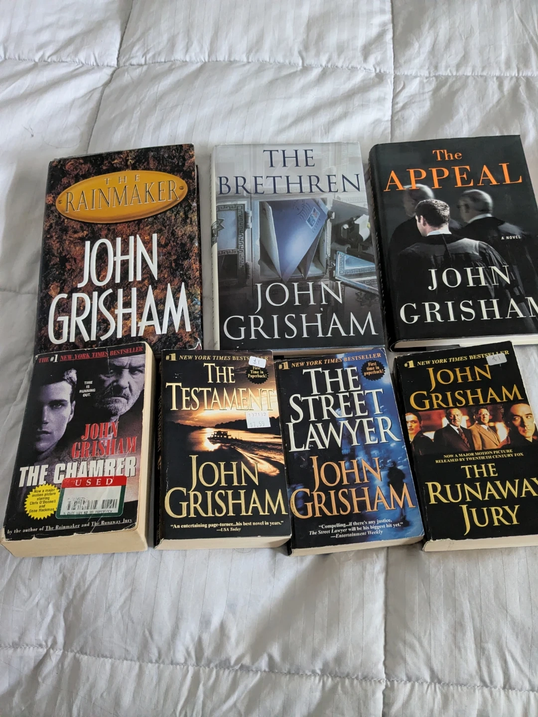 A collection of seven novels by acclaimed author John Grisham. Titles include The Rainmaker, The Brethren, The Appeal, The Chamber, The Testament, and The Street Lawyer. These books are perfect for fans of legal thrillers. 3 hardcover, 4 softcover. In used/read condition but no damage to pages. Price is for lot or soft cover 1 each hardcover 3 each