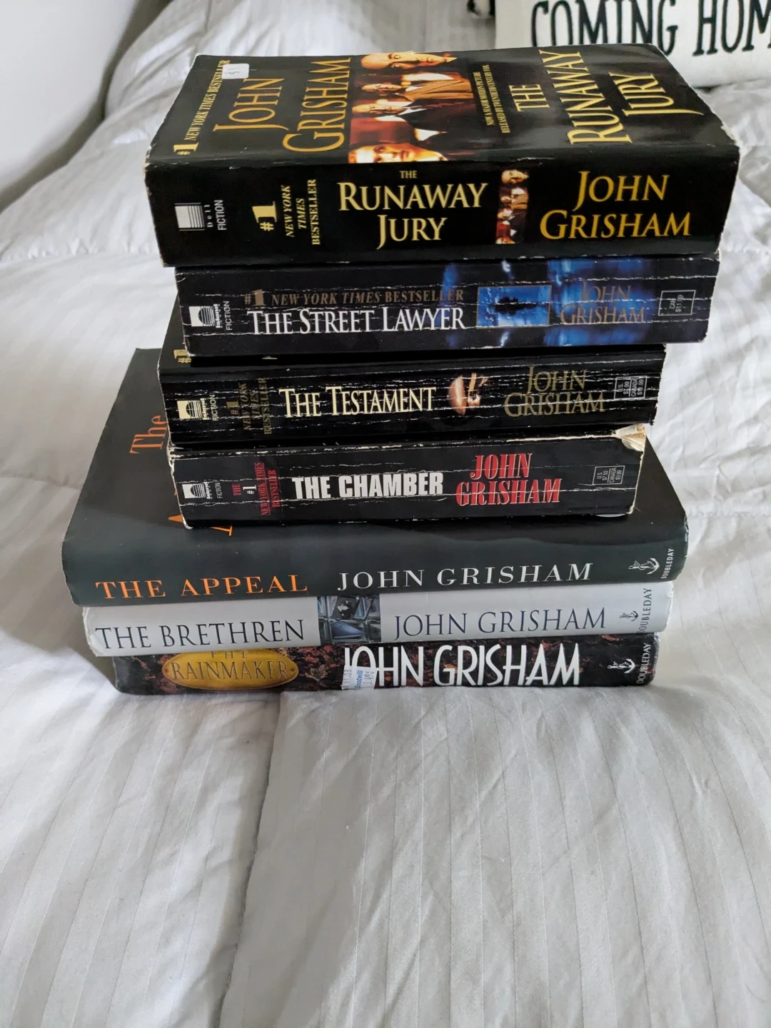 A collection of seven novels by acclaimed author John Grisham. Titles include The Rainmaker, The Brethren, The Appeal, The Chamber, The Testament, and The Street Lawyer. These books are perfect for fans of legal thrillers. 3 hardcover, 4 softcover. In used/read condition but no damage to pages. Price is for lot or soft cover 1 each hardcover 3 each