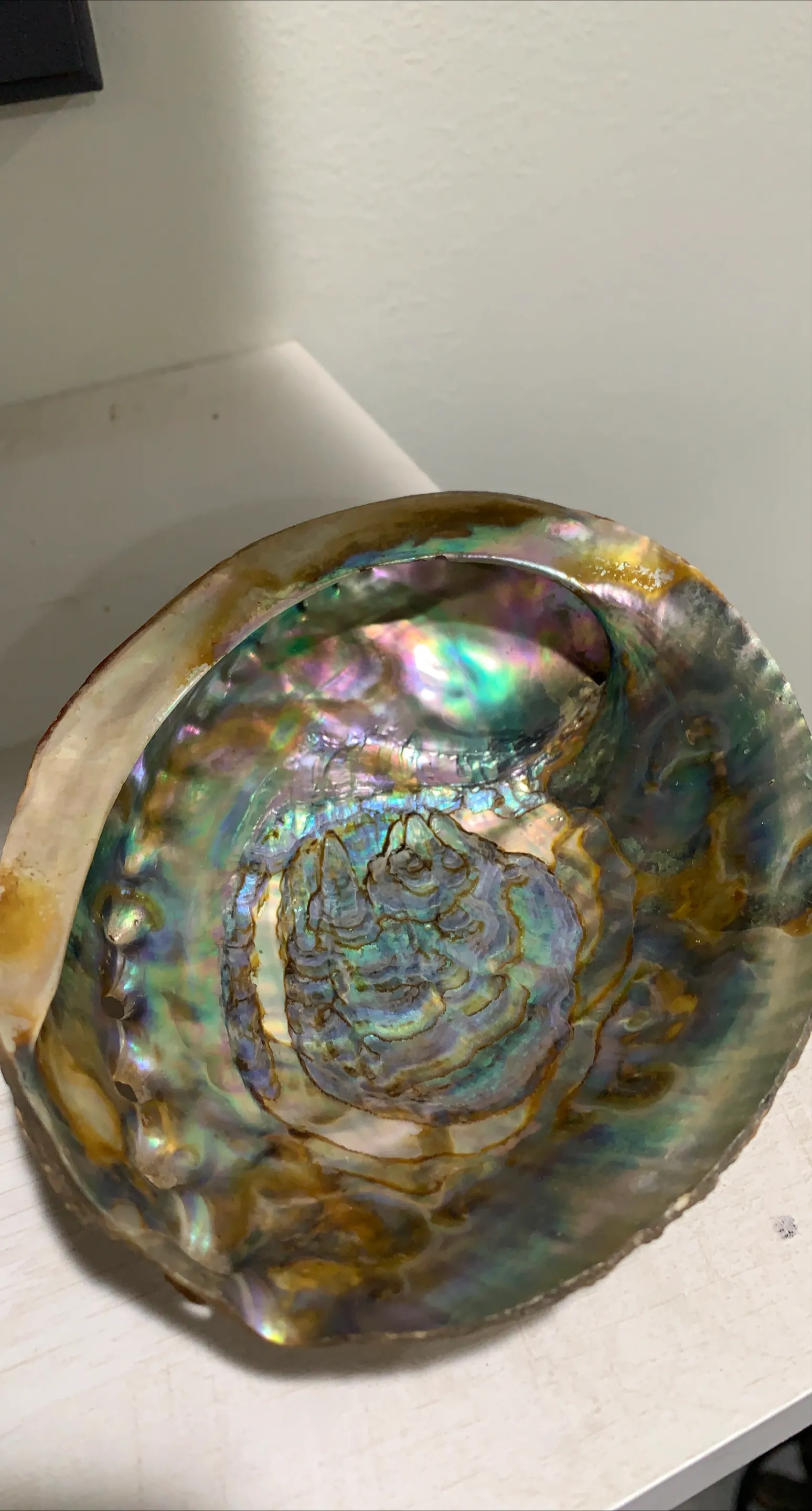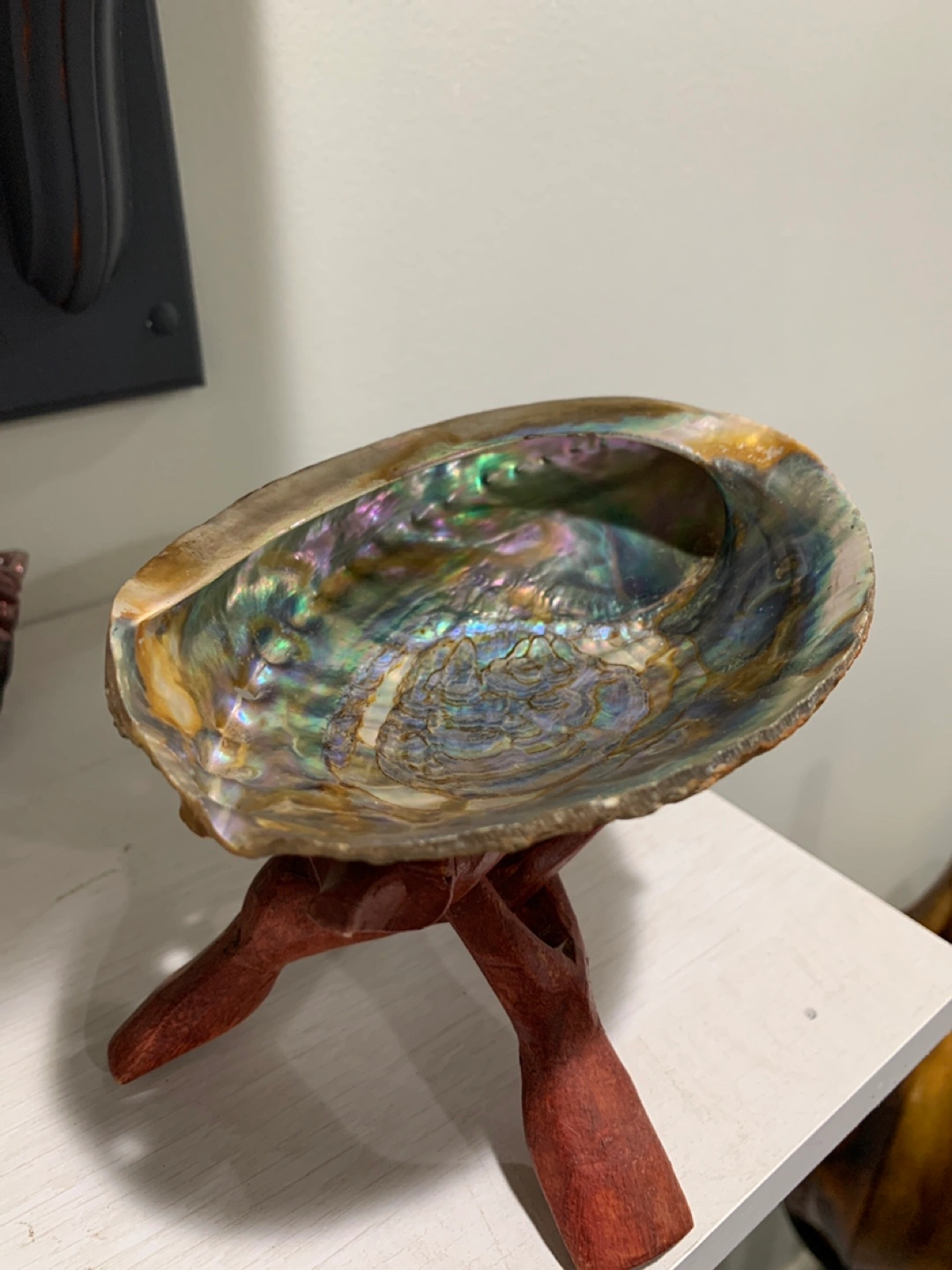 Beautiful abalone shell with a wooden stand! This unique piece would look great as decor in any room. The shell has a stunning iridescent interior. It is in great condition and ready for a new home