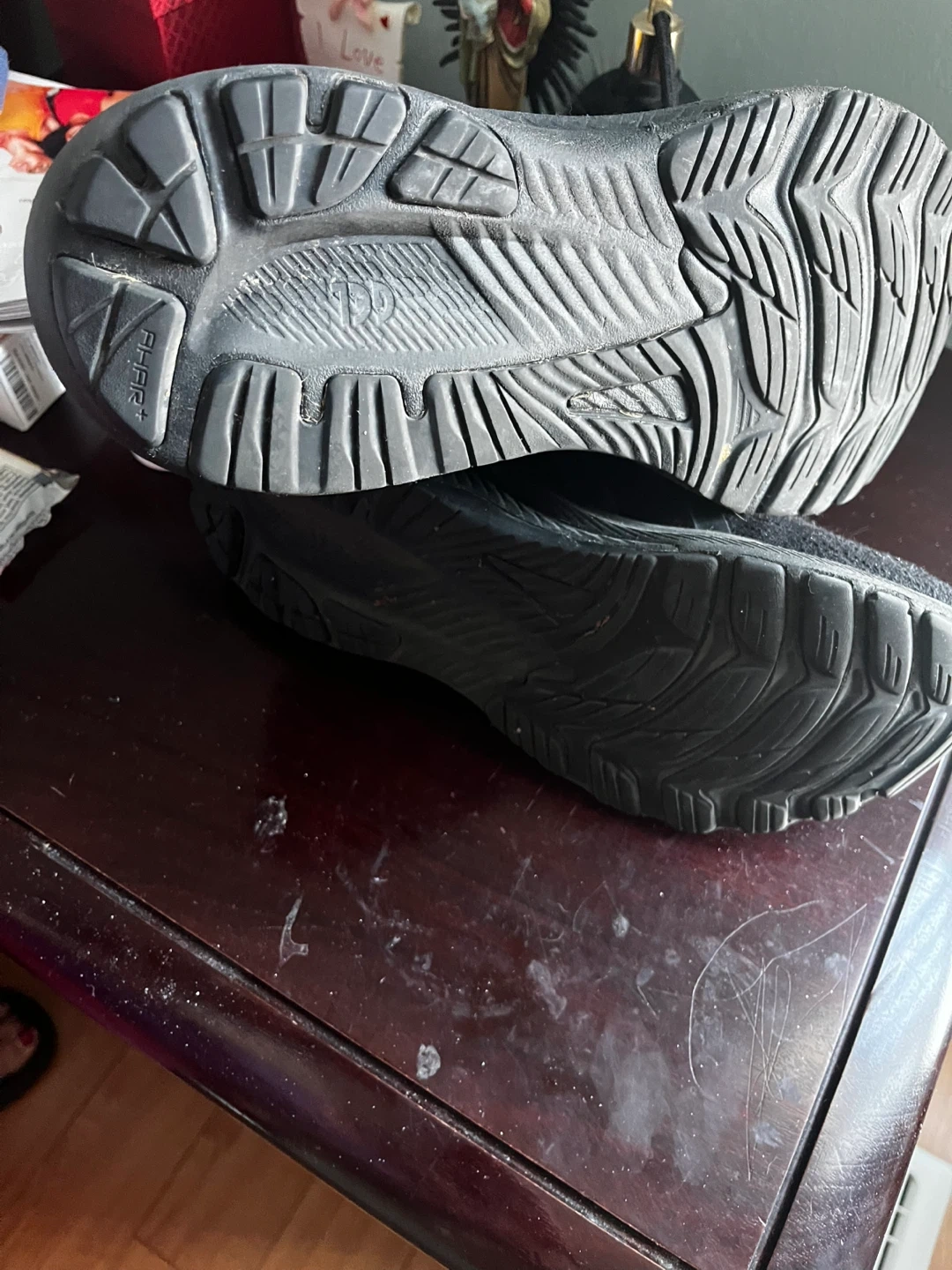 ASICS women black running shoes. EU size 39.5, US size 8. Made in Indonesia. These shoes are black with a knit upper and a sturdy rubber sole.