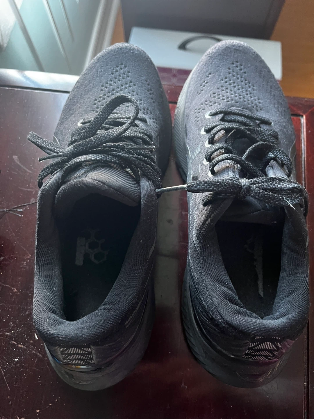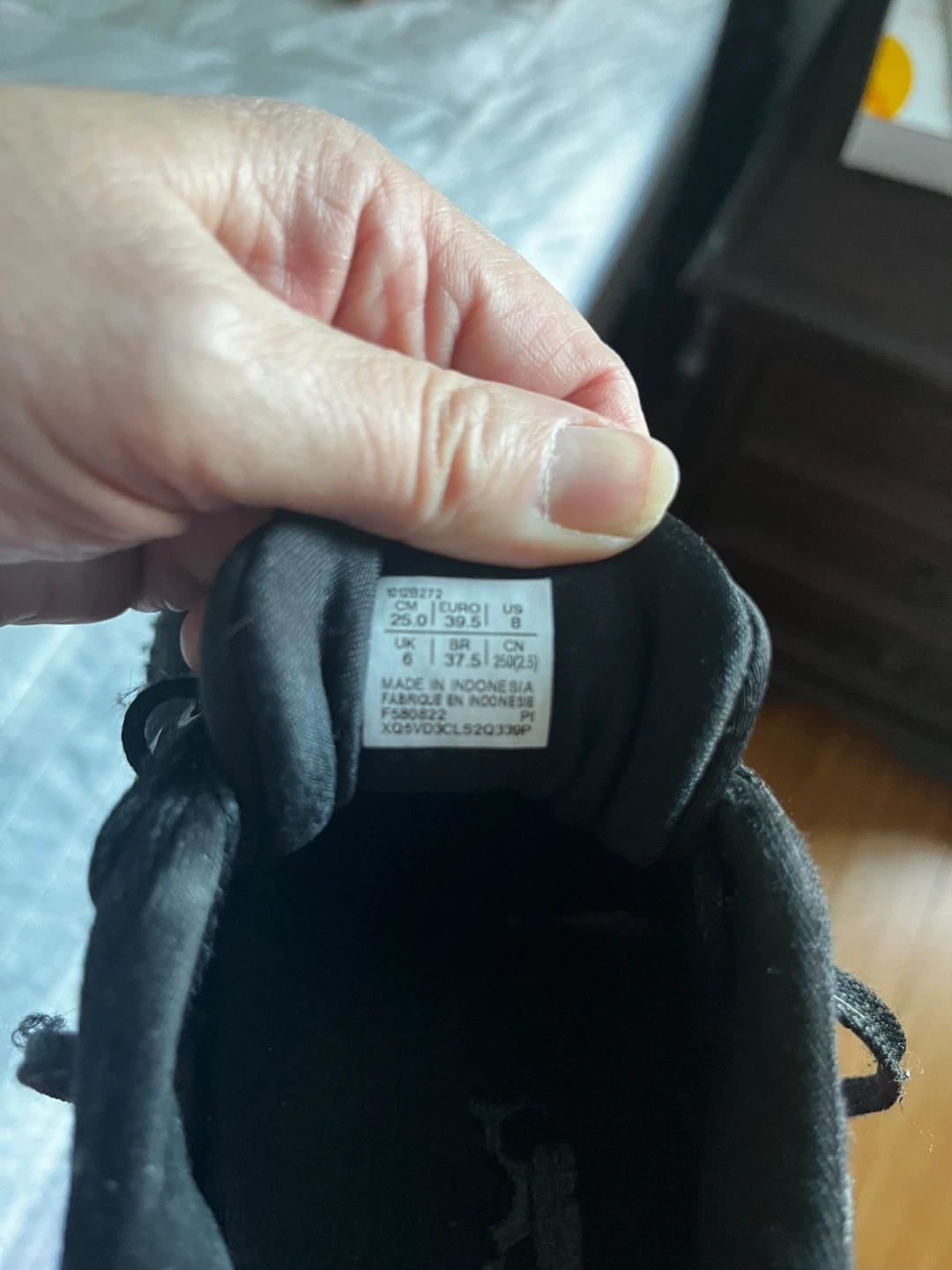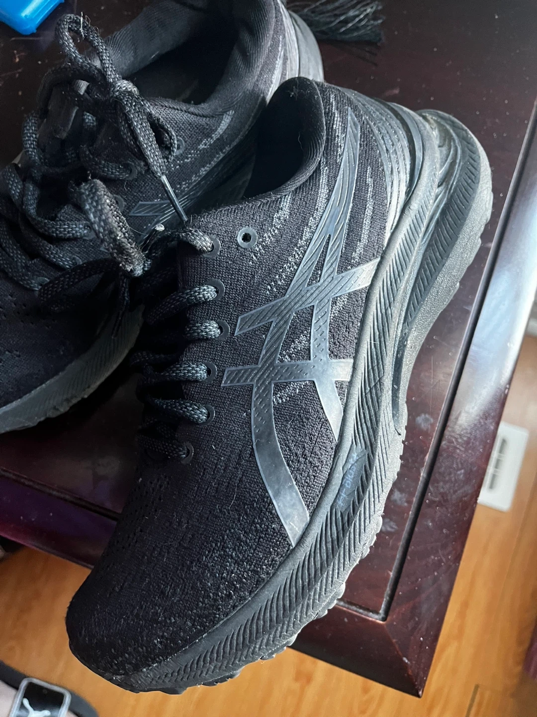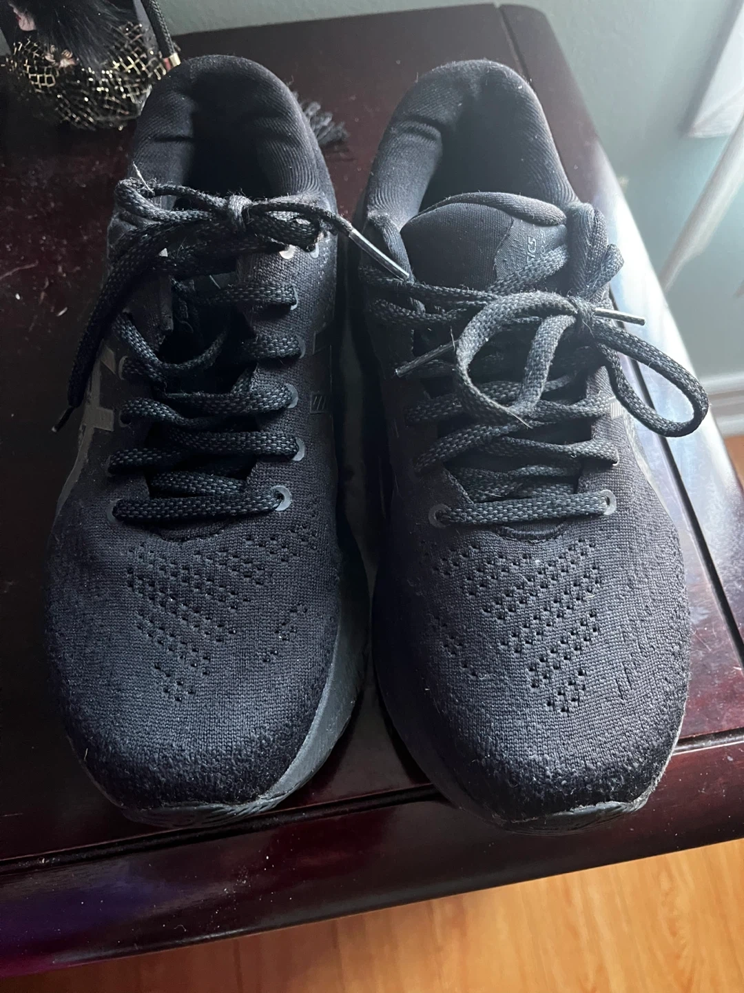 ASICS women black running shoes. EU size 39.5, US size 8. Made in Indonesia. These shoes are black with a knit upper and a sturdy rubber sole.