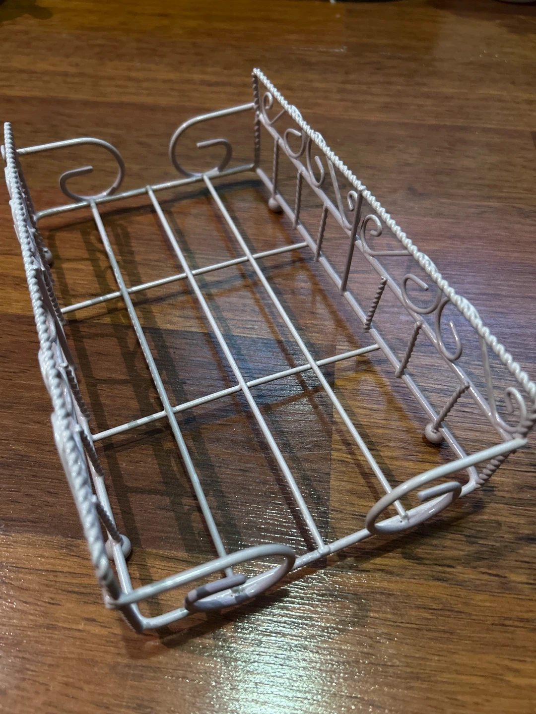 This is a small, decorative wire basket. It has a white metal construction with a braided trim and scroll details. It's great for holding small items on a shelf or desk.