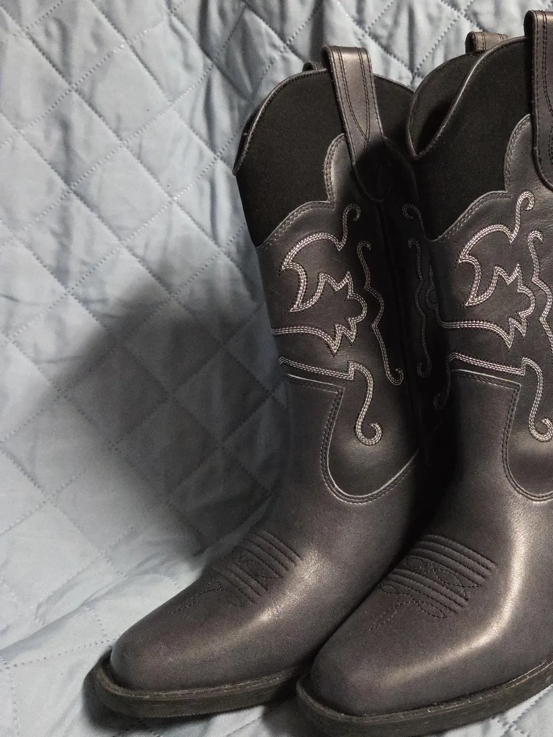 Selling a pair of black cowboy boots. They feature decorative stitching. Perfect for adding a bit of western flair to your wardrobe!