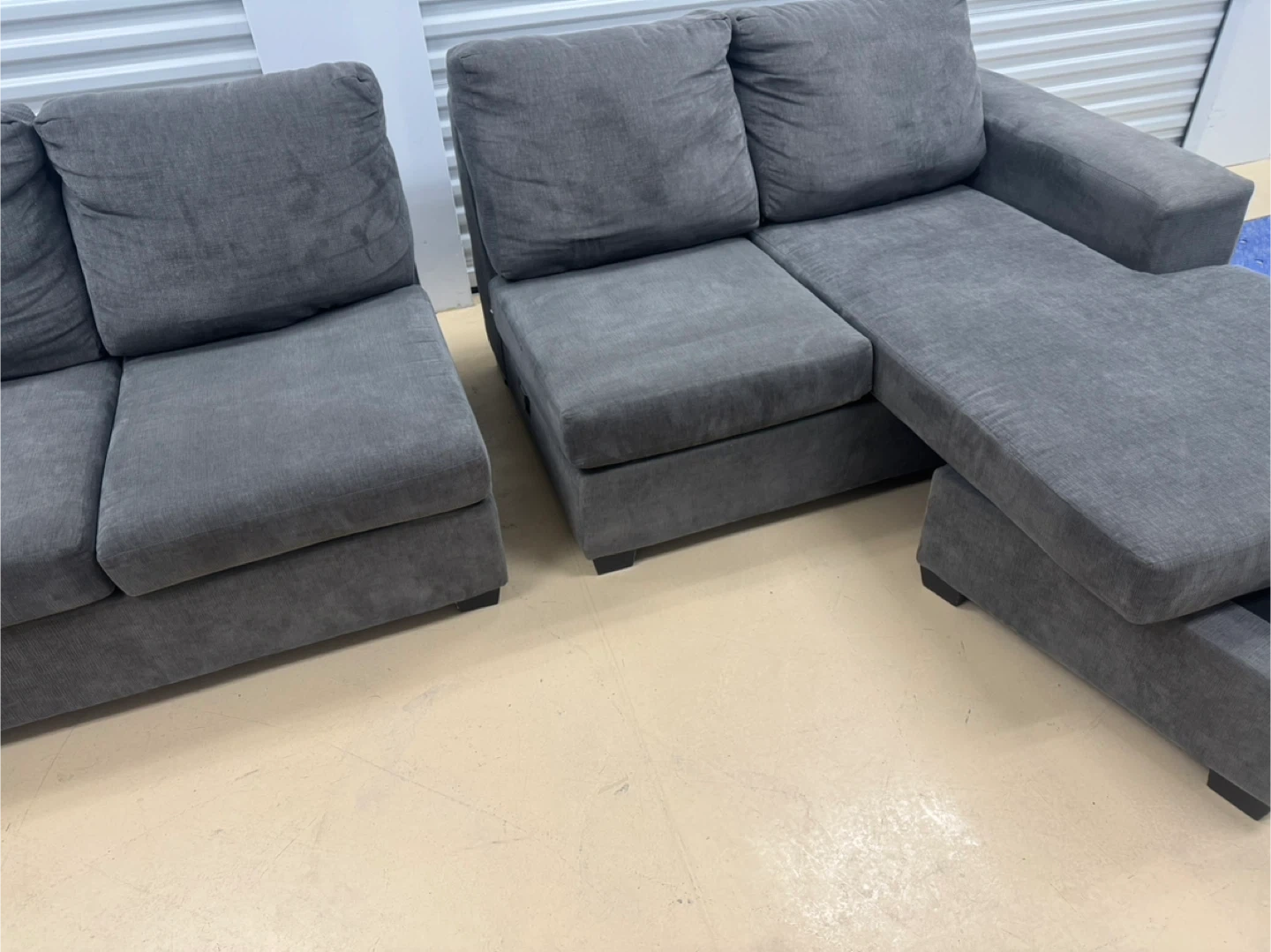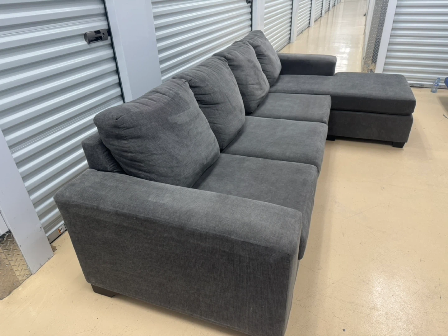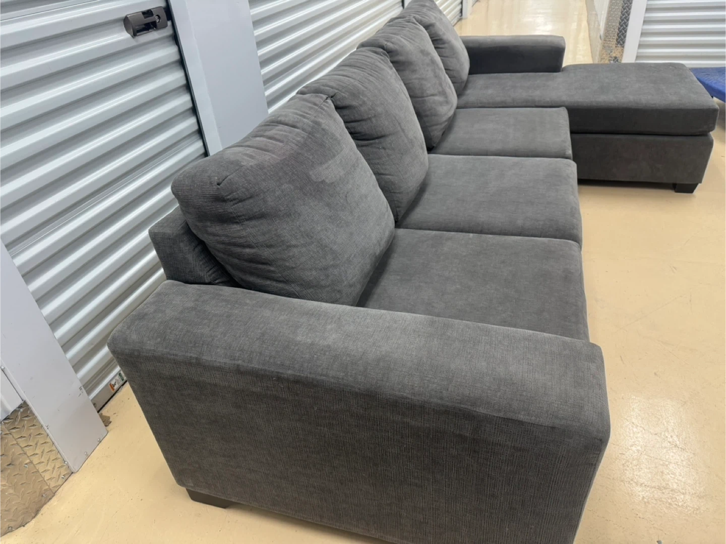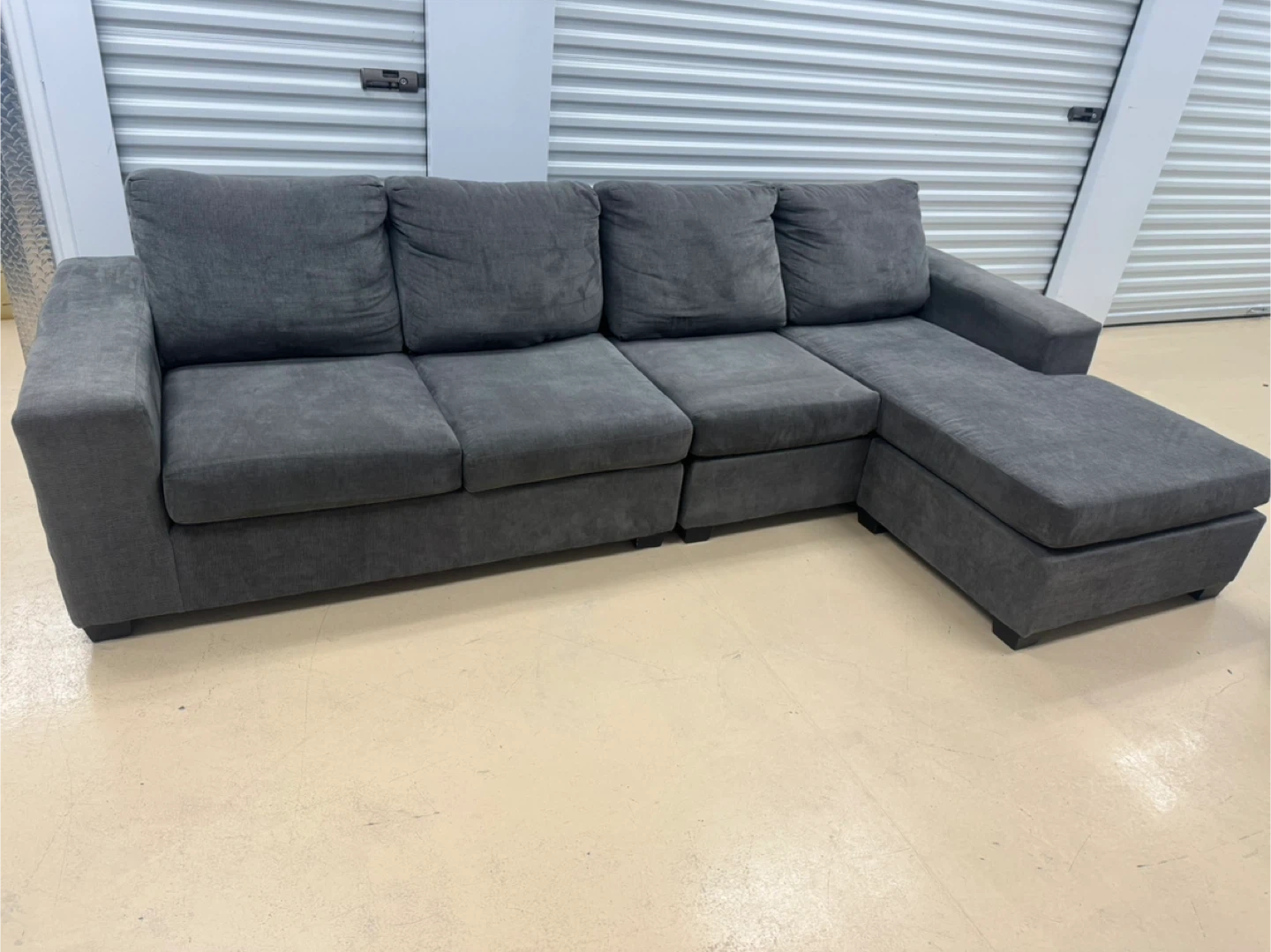 Selling a comfy grey sectional sofa with a chaise lounge! It's in great shape and ready for a new living room. The sectional features a modern design with plush cushions, perfect for lounging and relaxing. It would be a great addition to any home!home delivery available