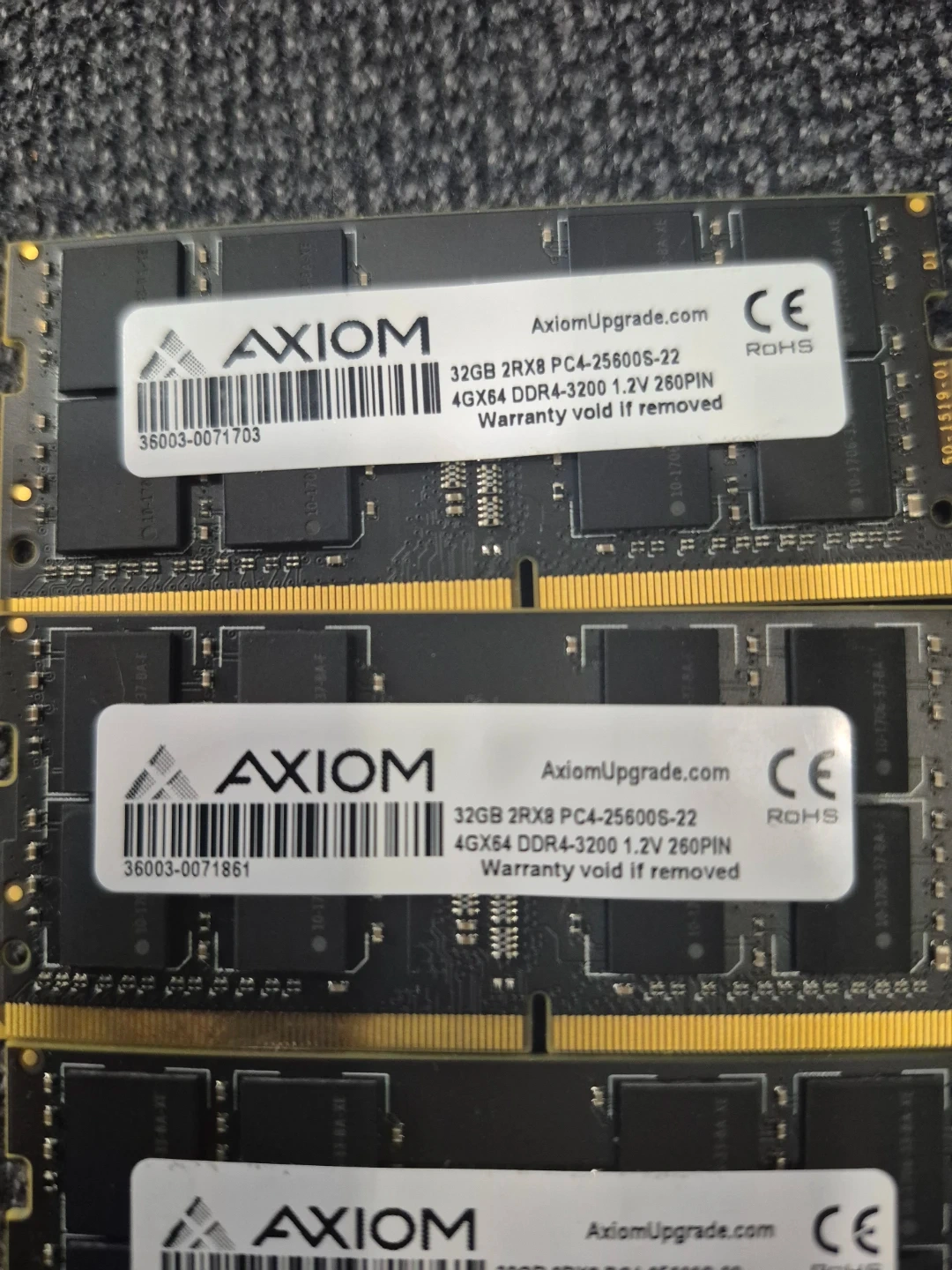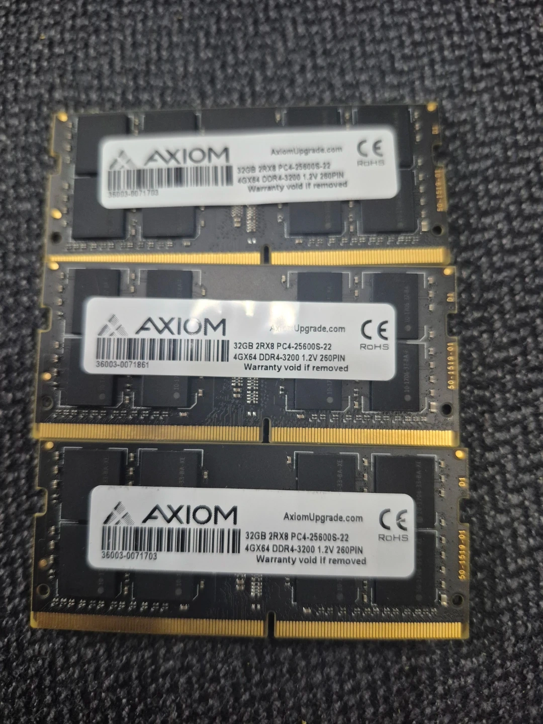 Three Axiom 32GB DDR4-3200 PC4-25600S-22 RAM modules. Each module is 4Gx64, 1.2V, 260PIN.