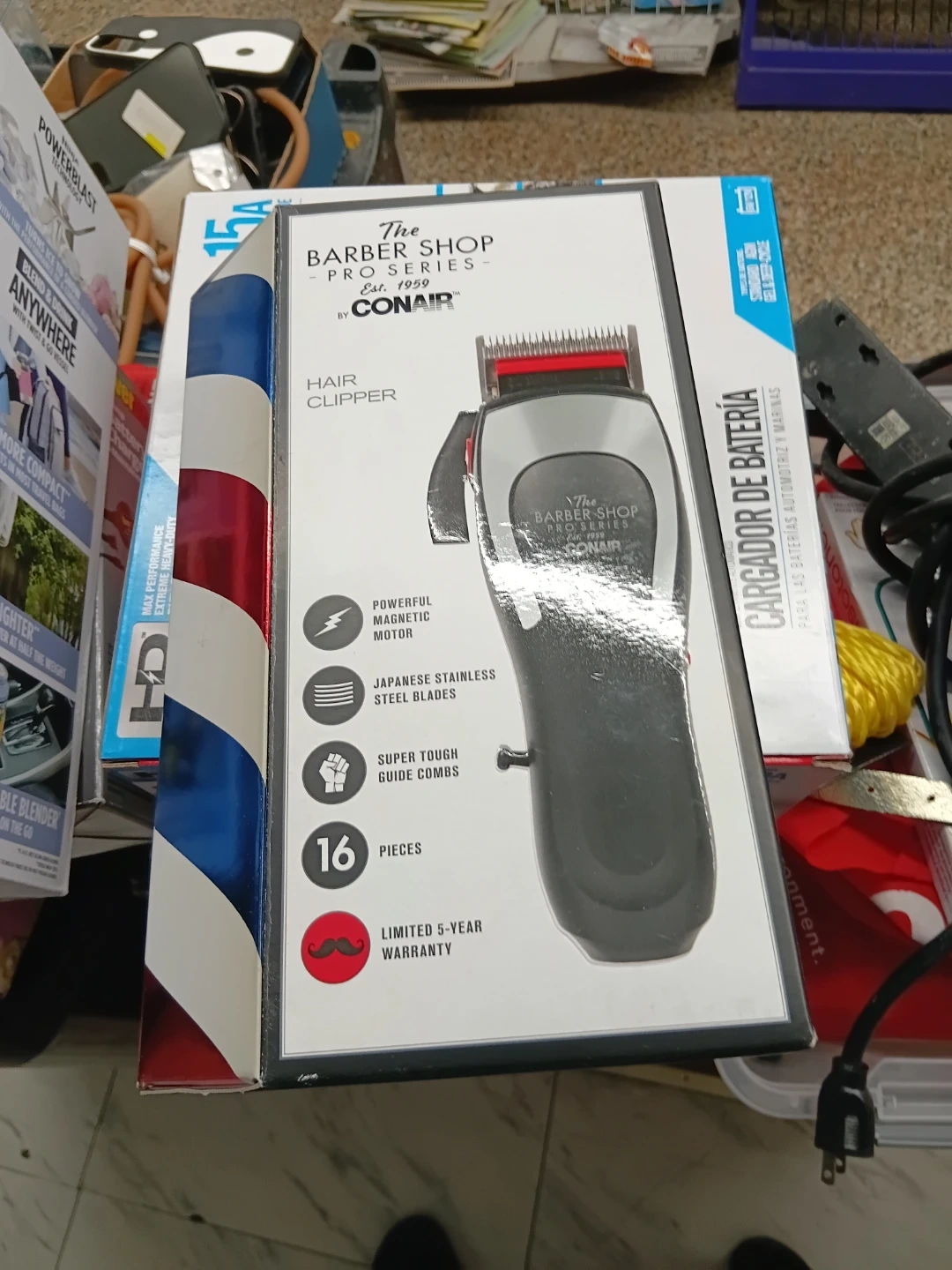 This Conair hair clipper features a powerful magnetic motor and Japanese stainless steel blades. It comes with 16 guide combs for versatile styling. A limited 5-year warranty is included.