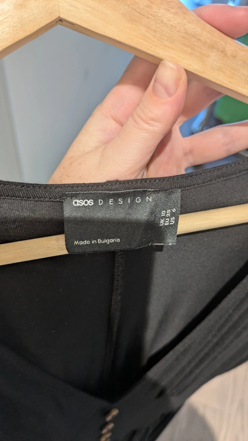 Never worn. Selling a cute black dress from ASOS Design! It's a size Canadian 6 / UK 10 and in great condition. Perfect for a casual day out or dressed up for an evening event. It features a V-neck and button detailing.