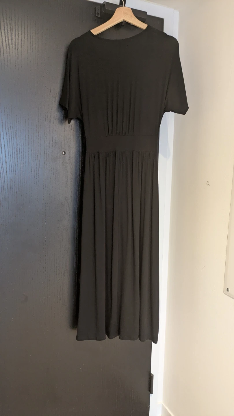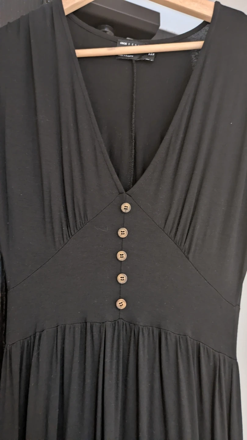 Never worn. Selling a cute black dress from ASOS Design! It's a size Canadian 6 / UK 10 and in great condition. Perfect for a casual day out or dressed up for an evening event. It features a V-neck and button detailing.