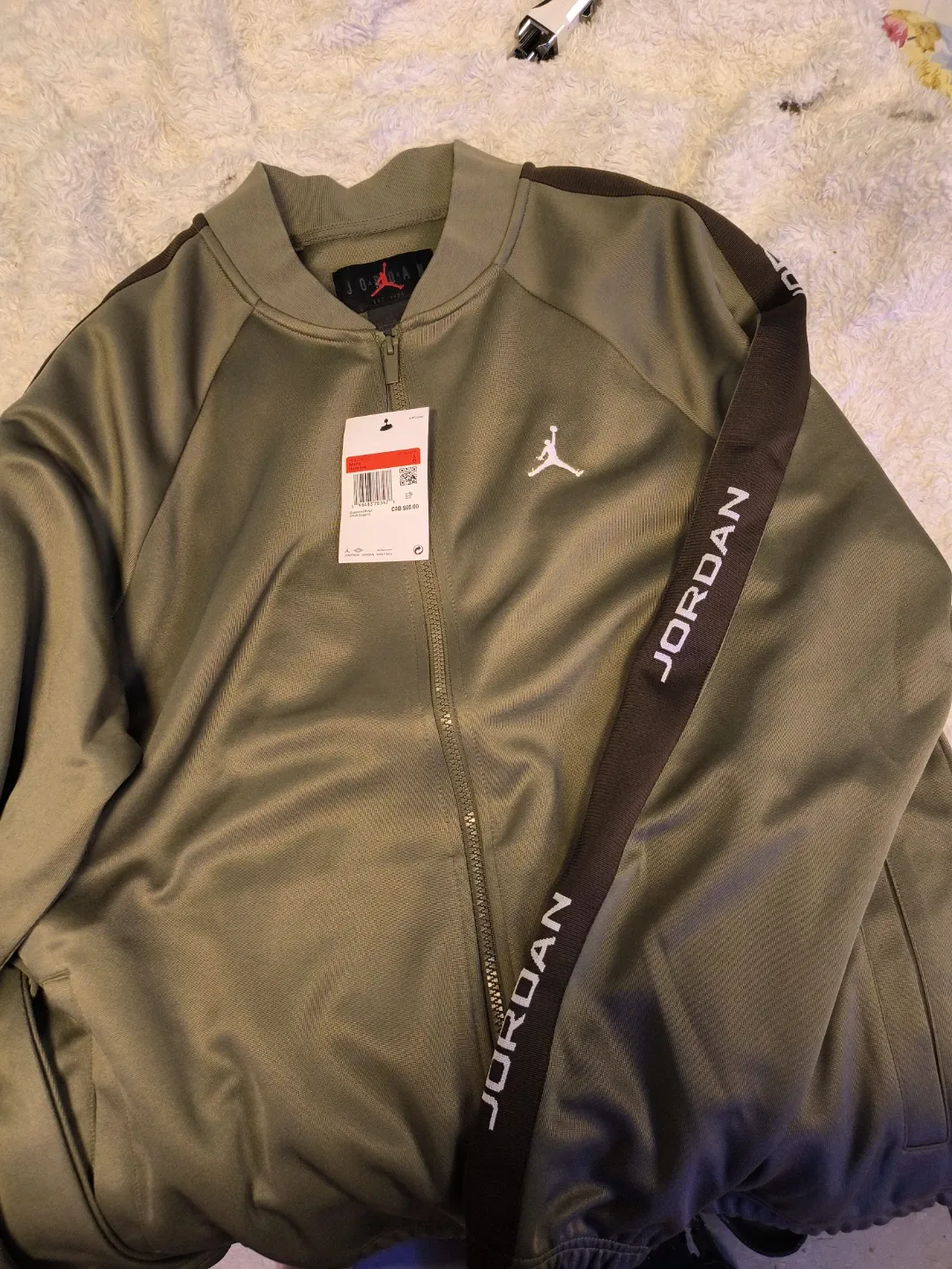 This is a Jordan track jacket with a Jumpman logo on the chest. It features contrasting "JORDAN" text down the sleeves. It's a full-zip style with pockets. Jacket's colour is olive green.